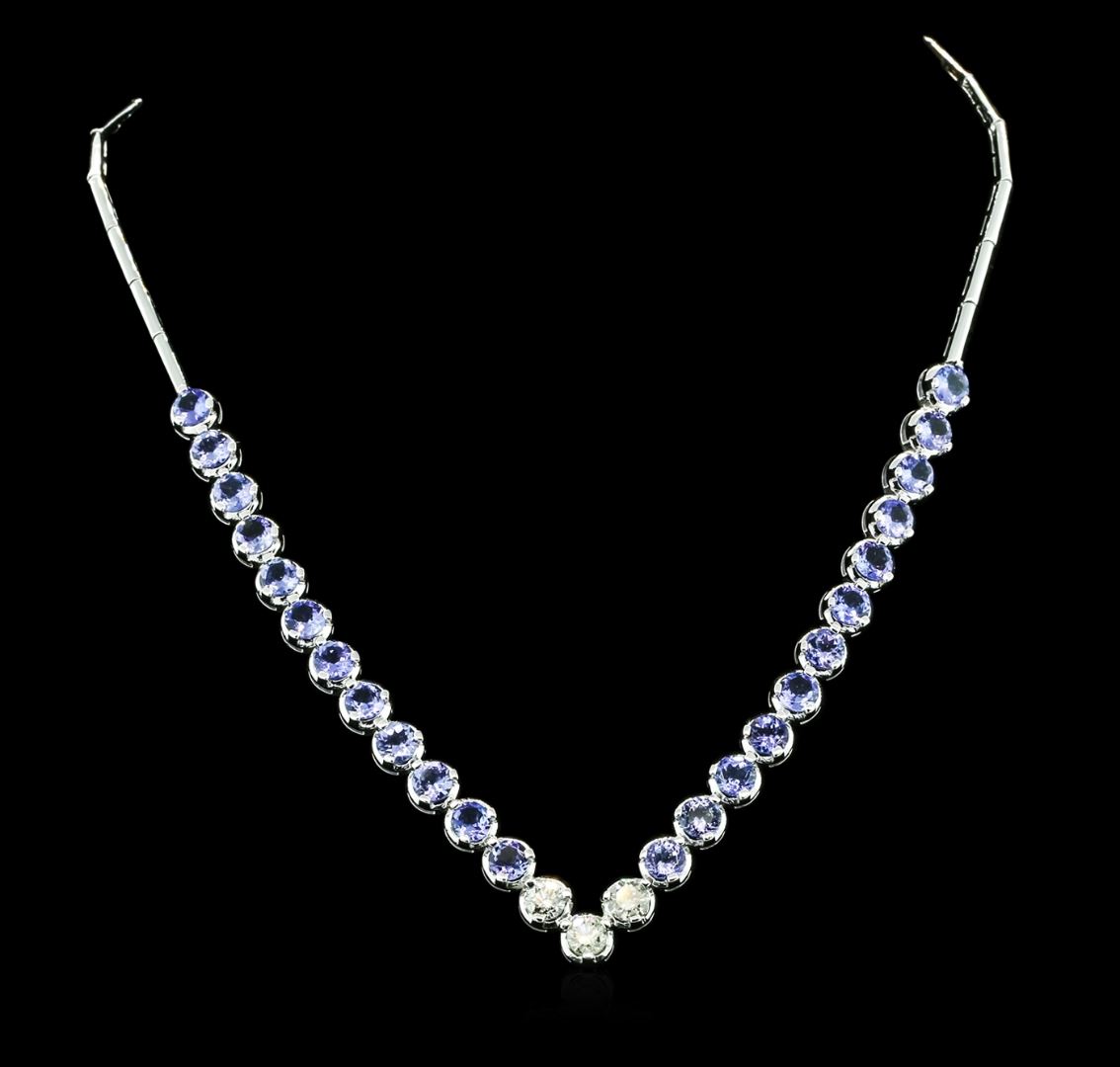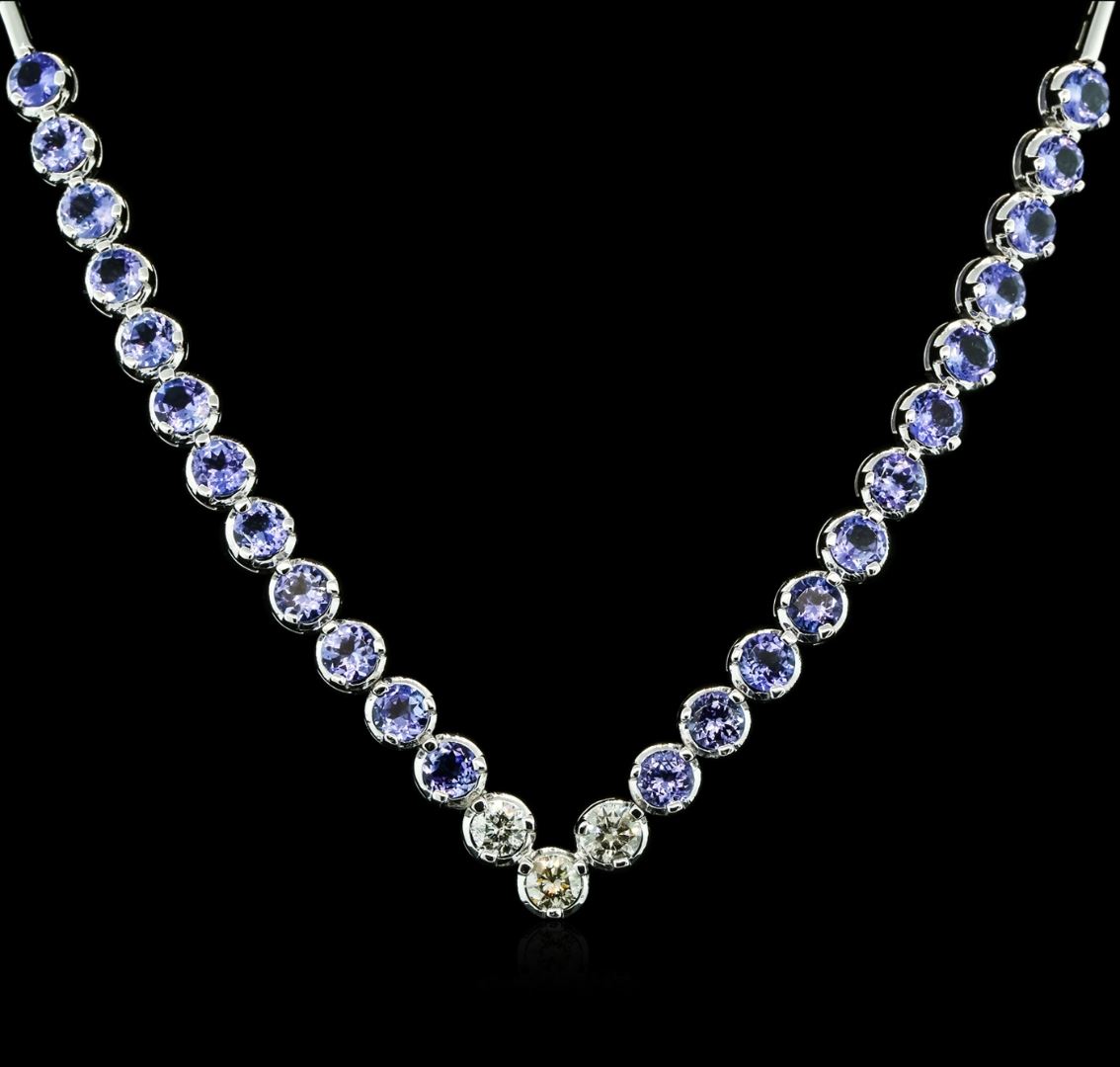 One electronically tested 14KT white gold ladies combination cast & assembled tanzanite and diamond necklace with a hidden box clasp with safety closer with a bright polish finish. Identified with markings of "14K". Condition is new. Containing: Twenty-four prong set round modified brilliant cut natural tanzanites, measuring 5.46 - 5.38 x 3.35 mm, approximate total weight of 16.08ct., clarity is eye clean, type I, medium light, very slightly grayish, violet color, (GIA V 4/3), cut is good. Three prong set round brilliant cut diamonds, measuring 5.50 - 5.15 x 3.20mm (depth est.) approximate total weight of 3 Stones = 1.66ct. Clarity: I-1 to I-2. Color: K - L, Cut is Good. All diamonds and colored gemstones are graded in the mounting, unless otherwise stated. Colored gemstones are presumed to have been subjected to commonly used enhancement processes. Total Weight of Colored Stones 16.08ct. Total Weight of Diamonds 1.66ct. Total Weight of Necklace 34.19 grams. GGL Appraised at $13,020.00.