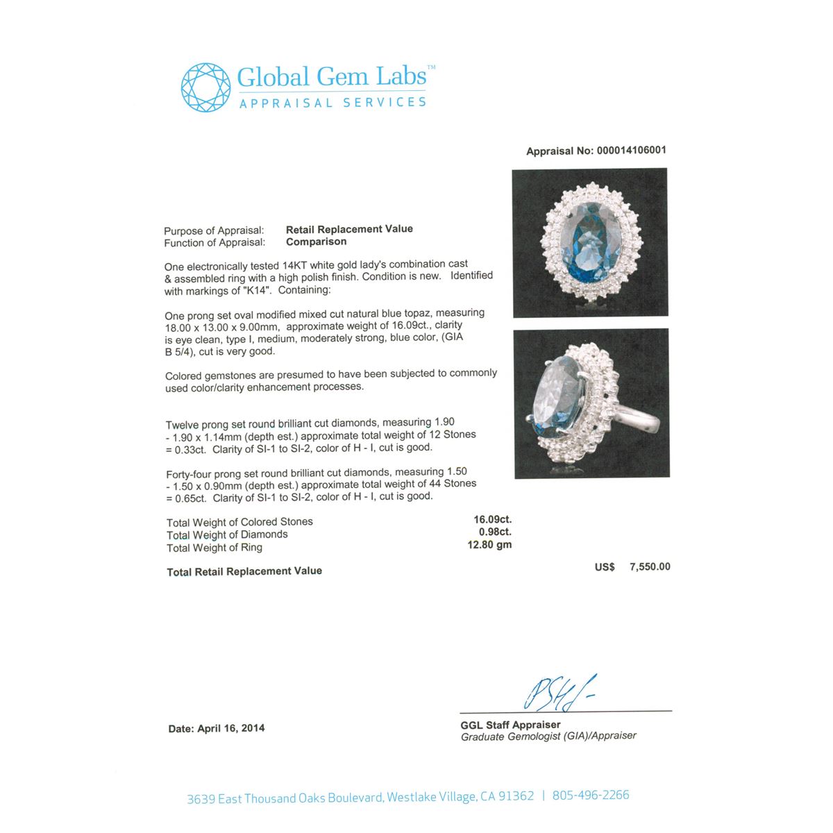 One electronically tested 14KT white gold Ladies combination cast & assembled ring with a high polish finish. Condition is new. Identified with markings of "K14". Containing: One prong set oval modified mixed cut natural blue topaz, measuring 18.00 x 13.00 x 9.00mm, approximate weight of 16.09ct., clarity is eye clean, type I, medium, moderately strong, blue color, (GIA B 5/4), cut is very good. Colored gemstones are presumed to have been subjected to commonly used color/clarity enhancement processes. Twelve prong set round brilliant cut diamonds, measuring 1.90 - 1.90 x 1.14mm (depth est.) approximate. Total Weight of 12 Stones = 0.33ct. Clarity: SI-1 to SI-2. Color: H - I, Cut is Good. Forty-Four prong set round brilliant cut diamonds, measuring 1.50 - 1.50 x 0.90mm (depth est.) approximate. Total Weight of 44 Stones = 0.65ct. Clarity: SI-1 to SI-2. Color: H - I, Cut is Good. Total Weight of Colored Stones 16.09ct. Total Weight of Diamonds 0.98ct. Total Weight of Ring 12.80 grams. GGL Appraised at $7,550.00.