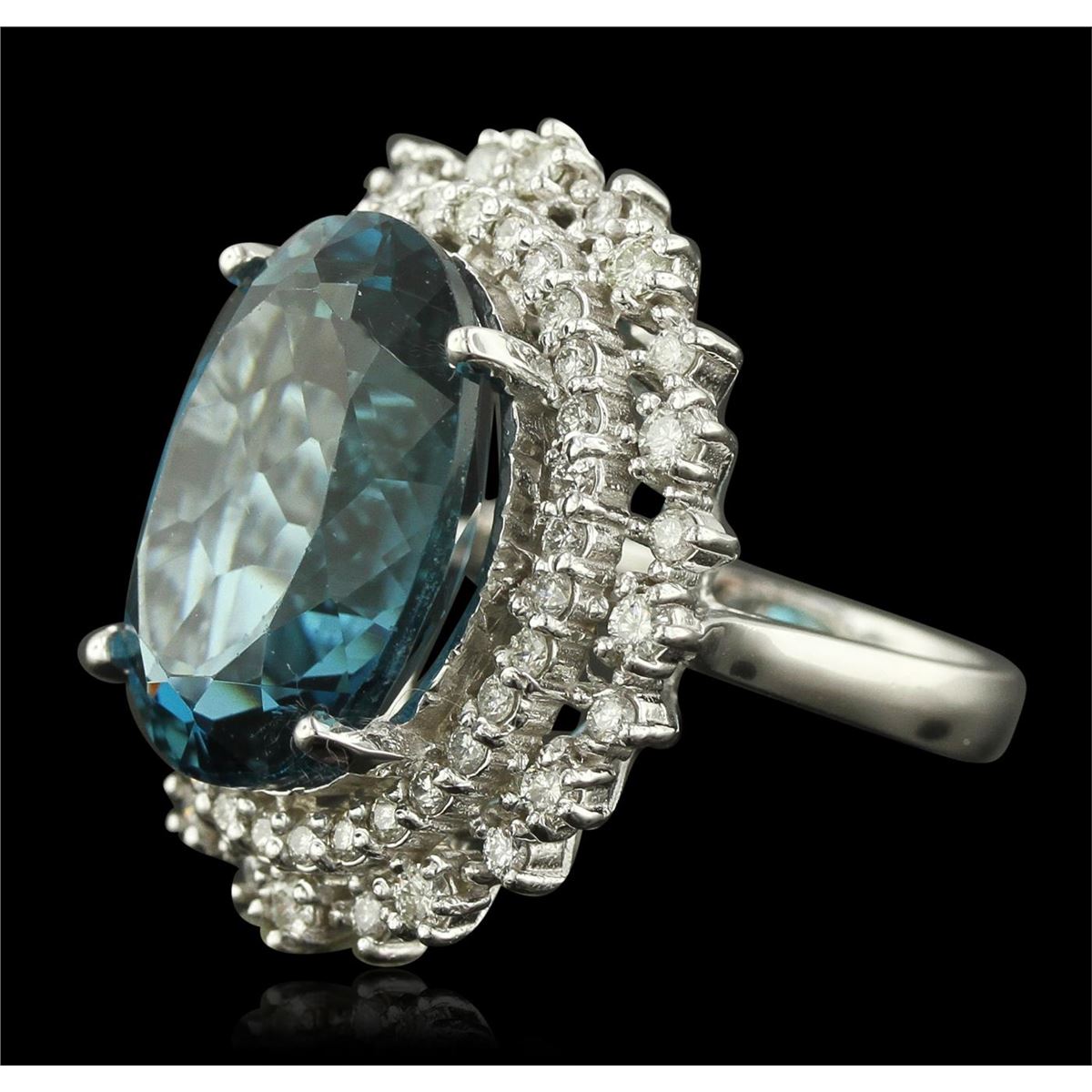 One electronically tested 14KT white gold Ladies combination cast & assembled ring with a high polish finish. Condition is new. Identified with markings of "K14". Containing: One prong set oval modified mixed cut natural blue topaz, measuring 18.00 x 13.00 x 9.00mm, approximate weight of 16.09ct., clarity is eye clean, type I, medium, moderately strong, blue color, (GIA B 5/4), cut is very good. Colored gemstones are presumed to have been subjected to commonly used color/clarity enhancement processes. Twelve prong set round brilliant cut diamonds, measuring 1.90 - 1.90 x 1.14mm (depth est.) approximate. Total Weight of 12 Stones = 0.33ct. Clarity: SI-1 to SI-2. Color: H - I, Cut is Good. Forty-Four prong set round brilliant cut diamonds, measuring 1.50 - 1.50 x 0.90mm (depth est.) approximate. Total Weight of 44 Stones = 0.65ct. Clarity: SI-1 to SI-2. Color: H - I, Cut is Good. Total Weight of Colored Stones 16.09ct. Total Weight of Diamonds 0.98ct. Total Weight of Ring 12.80 grams. GGL Appraised at $7,550.00.