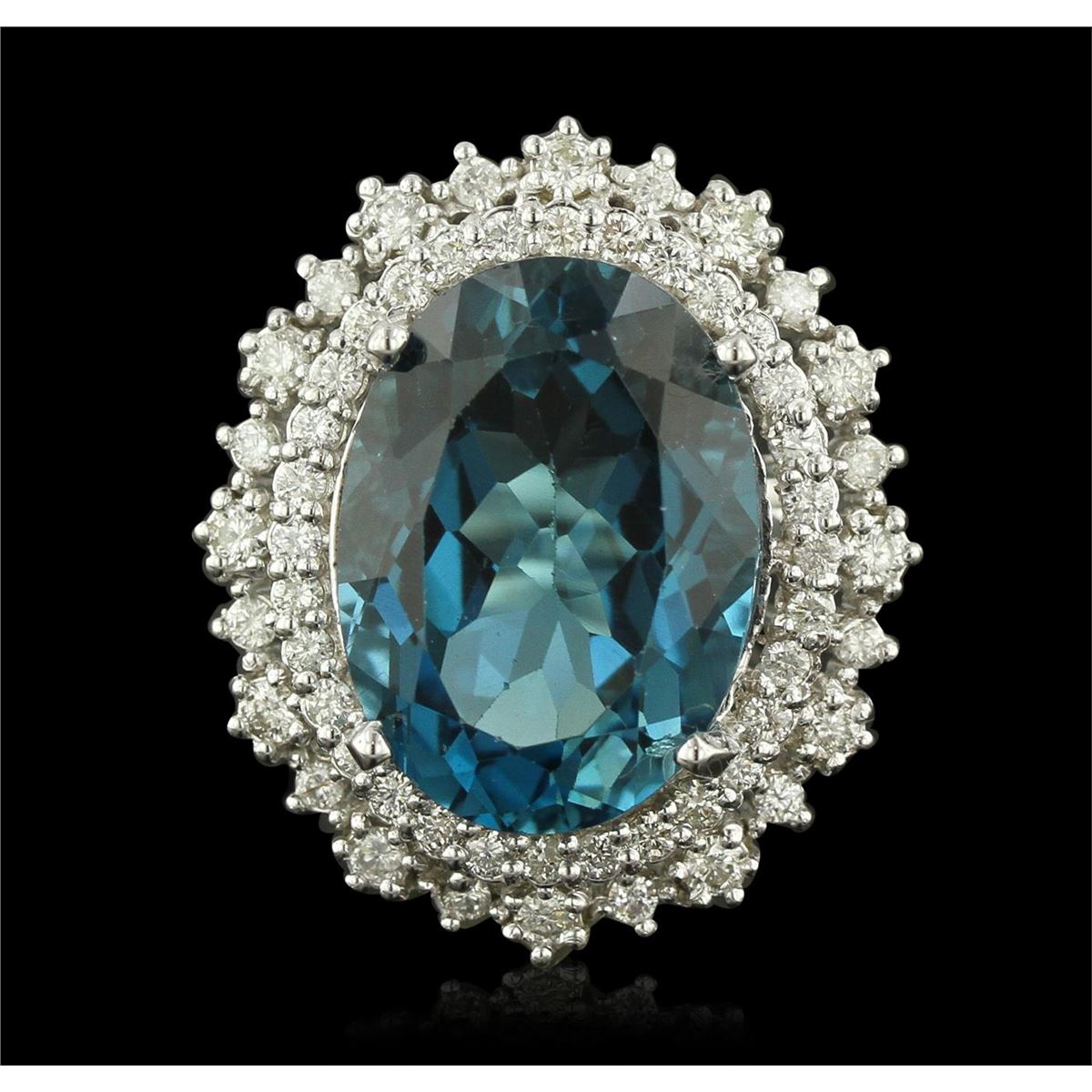 One electronically tested 14KT white gold Ladies combination cast & assembled ring with a high polish finish. Condition is new. Identified with markings of "K14". Containing: One prong set oval modified mixed cut natural blue topaz, measuring 18.00 x 13.00 x 9.00mm, approximate weight of 16.09ct., clarity is eye clean, type I, medium, moderately strong, blue color, (GIA B 5/4), cut is very good. Colored gemstones are presumed to have been subjected to commonly used color/clarity enhancement processes. Twelve prong set round brilliant cut diamonds, measuring 1.90 - 1.90 x 1.14mm (depth est.) approximate. Total Weight of 12 Stones = 0.33ct. Clarity: SI-1 to SI-2. Color: H - I, Cut is Good. Forty-Four prong set round brilliant cut diamonds, measuring 1.50 - 1.50 x 0.90mm (depth est.) approximate. Total Weight of 44 Stones = 0.65ct. Clarity: SI-1 to SI-2. Color: H - I, Cut is Good. Total Weight of Colored Stones 16.09ct. Total Weight of Diamonds 0.98ct. Total Weight of Ring 12.80 grams. GGL Appraised at $7,550.00.