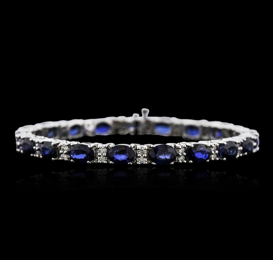 One electronically tested 14KT white gold ladies cast sapphire and diamond bracelet with a hidden box clasp with a bright polish finish. Measurements: 7.25" in length Identified with markings of "14K". Condition is new. Containing: Nineteen prong set oval modified brilliant cut natural blue sapphires, measuring 7.00 x 4.70 x 3.06mm, approximate total weight of 16.15ct., clarity is eye clean, type II, medium dark, moderately strong, blue color, (GIA B 6/4), cut is good. Thirty-Eight prong set round brilliant cut diamonds, measuring 1.60 - 1.60 x 0.96mm (depth est.) approximate total weight of 38 Stones = 0.57ct. Clarity: SI-1 to I-1. Color: I - J, Cut is Good. Colored gemstones are presumed to have been subjected to commonly used enhancement processes. All diamonds and colored gemstones are graded in the mounting, unless otherwise stated. Total Weight of Colored Stones 16.15ct. Total Weight of Diamonds 0.57ct. Total Weight of Bracelet 21.60 grams. GGL Appraised at $9,340.00.