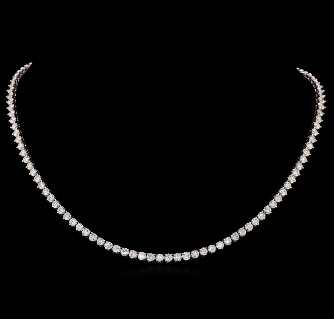 One electronically tested 14KT white gold ladies cast diamond necklace with a hidden box clasp with a bright polish finish. Measurements: 16.50" in length Identified with markings of "14K". Condition is new. Containing: One Hundred Seventeen prong set round brilliant cut diamonds, measuring 3.20 - 3.00 x 1.86mm (depth est.) approximate total weight of 117 Stones = 16.16ct. Clarity: SI-2 to I-2. Color: I - J, Cut is Good. All diamonds are graded in the mounting, unless otherwise stated. Total Weight of Diamonds 16.16ct. Total Weight of Necklace 21.60 grams. GGL Appraised at $28,045.00.