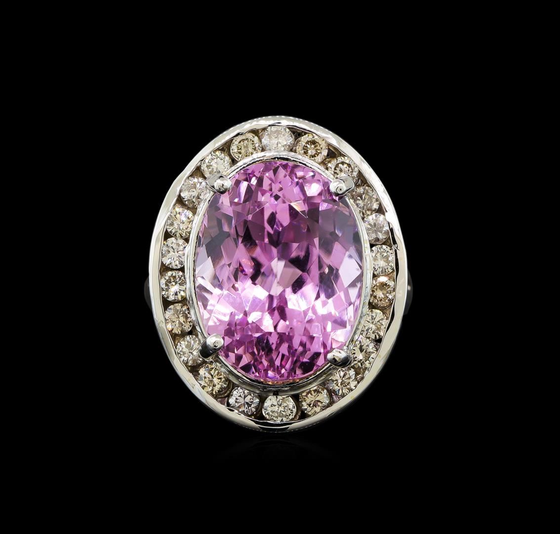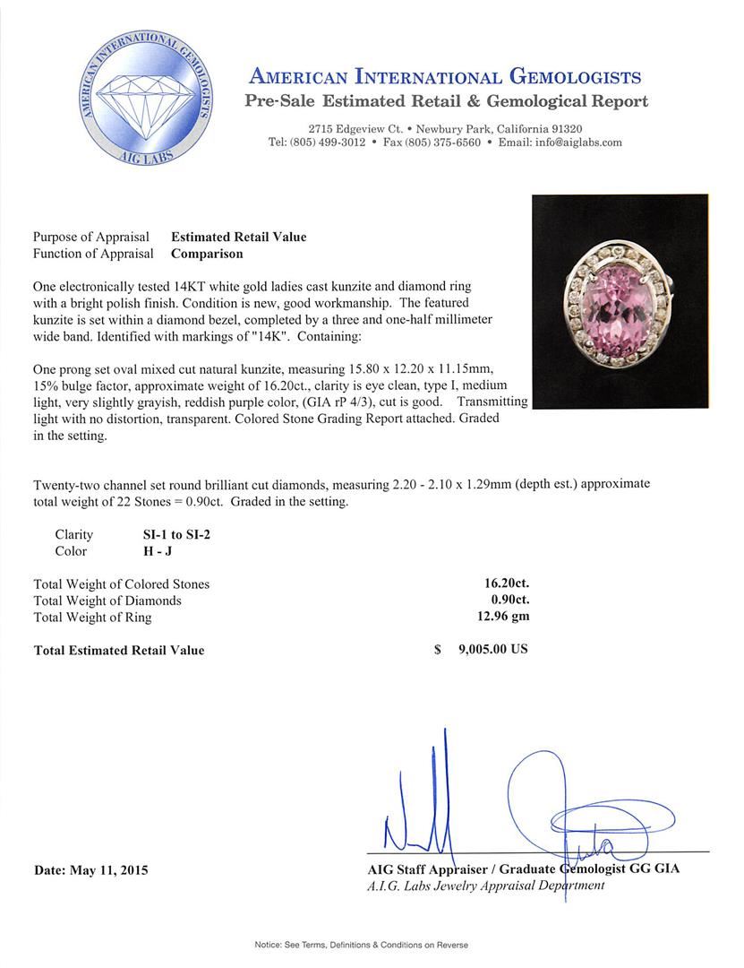 One electronically tested 14KT white gold ladies cast kunzite and diamond ring with a bright polish finish. The featured kunzite is set within a diamond bezel, completed by a three and one-half millimeter wide band. Identified with markings of "14K". Condition is new, good workmanship. Containing: One prong set oval mixed cut natural kunzite, measuring 15.80 x 12.20 x 11.15mm, 15% bulge factor, approximate weight of 16.20ct., clarity is eye clean, type I, medium light, very slightly grayish, reddish purple color, (GIA rP 4/3), cut is good. Transmitting light with no distortion, transparent. Colored Stone Grading Report attached. Graded in the setting. Twenty-Two channel set round brilliant cut diamonds, measuring 2.20 - 2.10 x 1.29mm (depth est.) approximate total weight of 22 Stones = 0.90ct. Graded in the setting. Clarity: SI-1 to SI-2. Color: H - J. Total Weight of Colored Stones 16.20ct. Total Weight of Diamonds 0.90ct. AIG Appraised at $9,005.00.