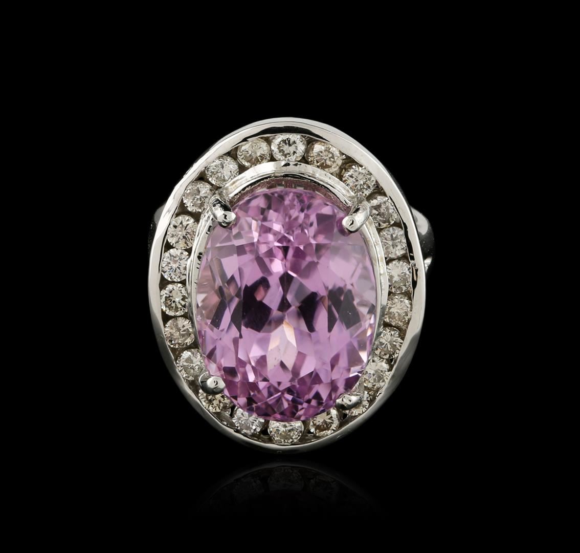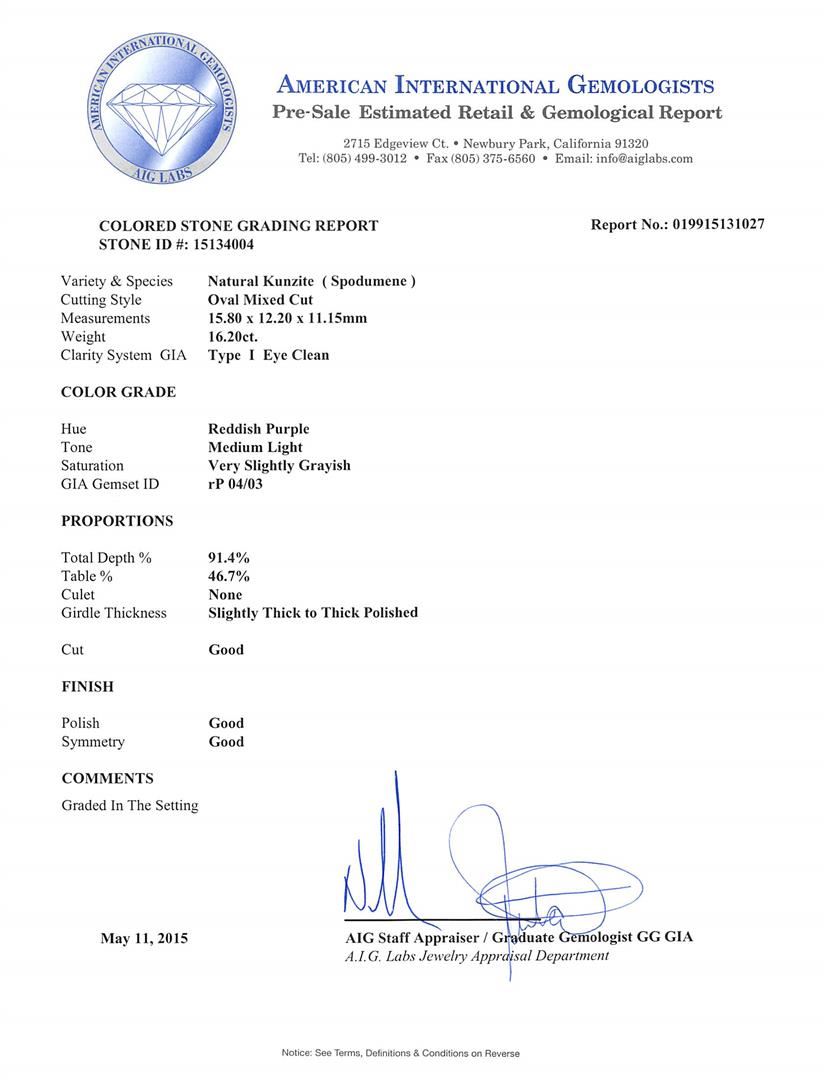 One electronically tested 14KT white gold ladies cast kunzite and diamond ring with a bright polish finish. The featured kunzite is set within a diamond bezel, completed by a three and one-half millimeter wide band. Identified with markings of "14K". Condition is new, good workmanship. Containing: One prong set oval mixed cut natural kunzite, measuring 15.80 x 12.20 x 11.15mm, 15% bulge factor, approximate weight of 16.20ct., clarity is eye clean, type I, medium light, very slightly grayish, reddish purple color, (GIA rP 4/3), cut is good. Transmitting light with no distortion, transparent. Colored Stone Grading Report attached. Graded in the setting. Twenty-Two channel set round brilliant cut diamonds, measuring 2.20 - 2.10 x 1.29mm (depth est.) approximate total weight of 22 Stones = 0.90ct. Graded in the setting. Clarity: SI-1 to SI-2. Color: H - J. Total Weight of Colored Stones 16.20ct. Total Weight of Diamonds 0.90ct. AIG Appraised at $9,005.00.