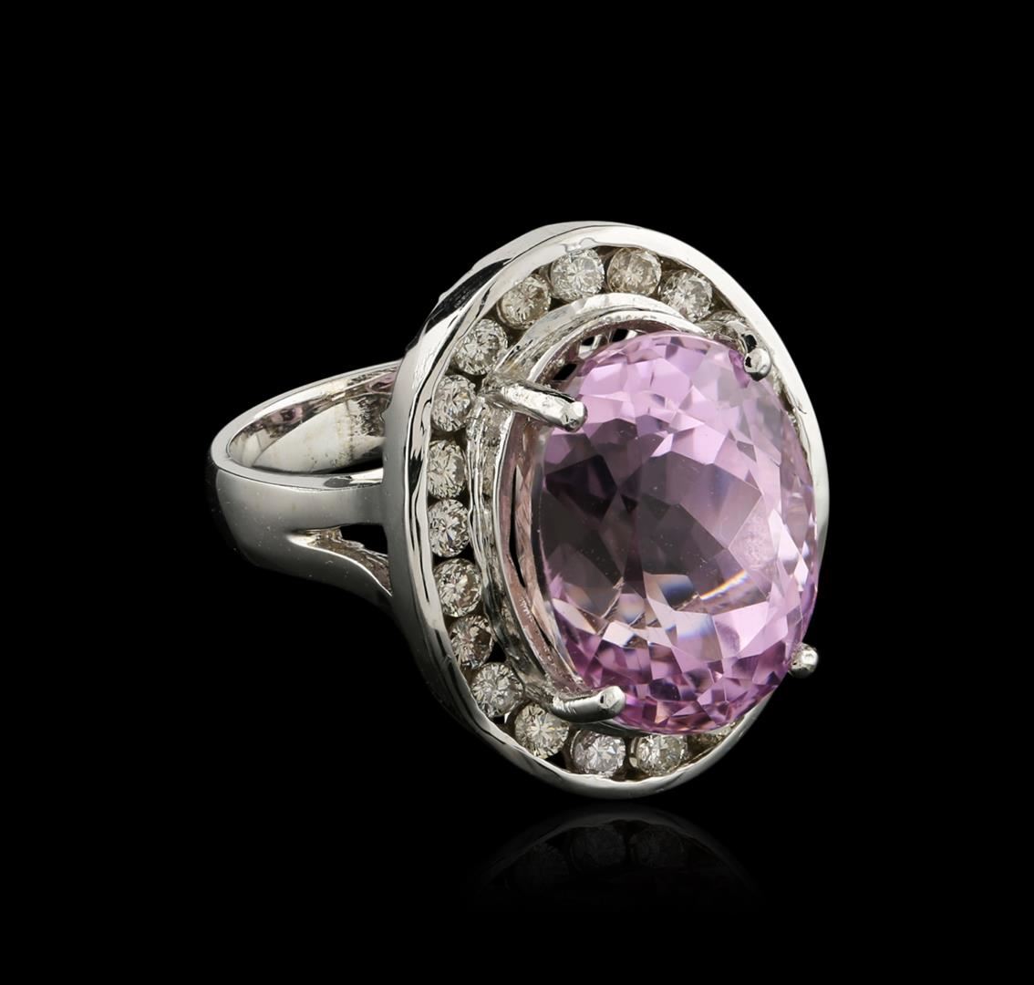 One electronically tested 14KT white gold ladies cast kunzite and diamond ring with a bright polish finish. The featured kunzite is set within a diamond bezel, completed by a three and one-half millimeter wide band. Identified with markings of "14K". Condition is new, good workmanship. Containing: One prong set oval mixed cut natural kunzite, measuring 15.80 x 12.20 x 11.15mm, 15% bulge factor, approximate weight of 16.20ct., clarity is eye clean, type I, medium light, very slightly grayish, reddish purple color, (GIA rP 4/3), cut is good. Transmitting light with no distortion, transparent. Colored Stone Grading Report attached. Graded in the setting. Twenty-Two channel set round brilliant cut diamonds, measuring 2.20 - 2.10 x 1.29mm (depth est.) approximate total weight of 22 Stones = 0.90ct. Graded in the setting. Clarity: SI-1 to SI-2. Color: H - J. Total Weight of Colored Stones 16.20ct. Total Weight of Diamonds 0.90ct. AIG Appraised at $9,005.00.