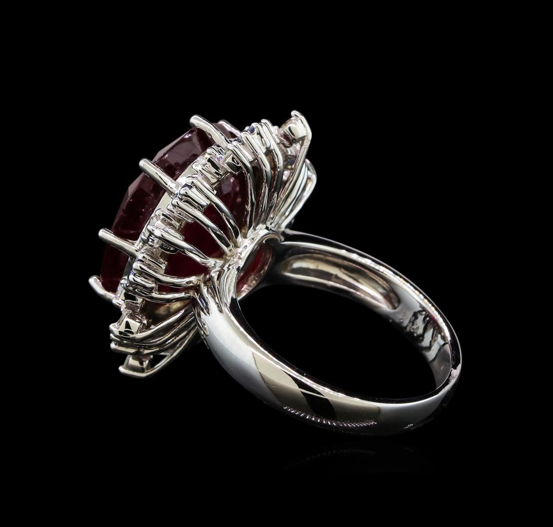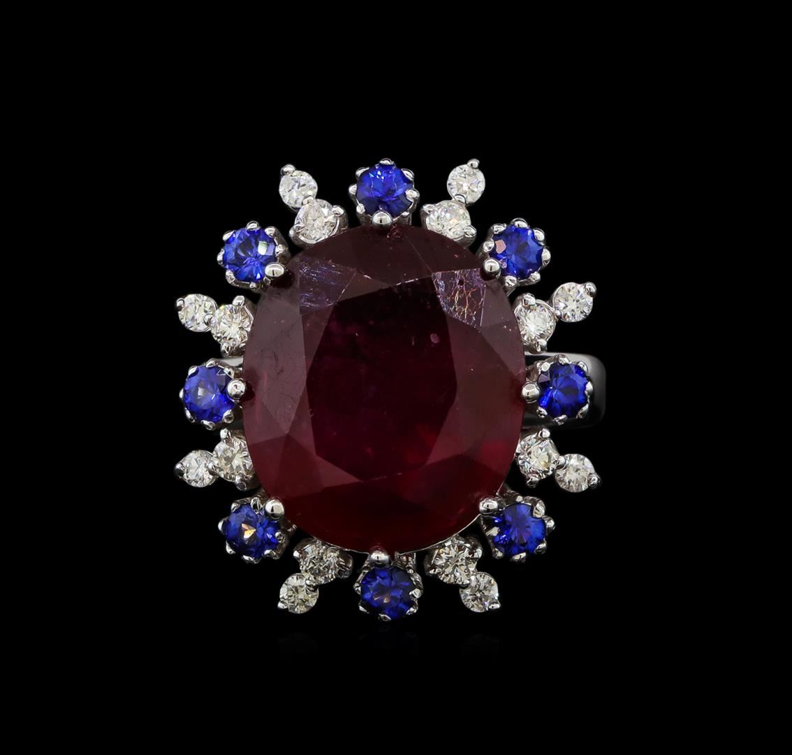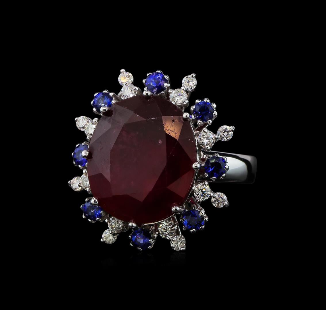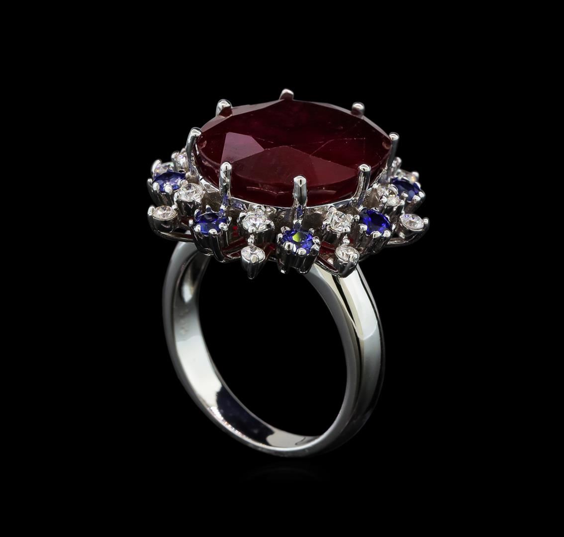 One electronically tested 14KT white gold ladies cast ruby, sapphire and diamond ring with a bright polish finish. Identified with markings of "14K". Condition is new. Containing: One prong set oval modified brilliant cut natural ruby, measuring 15.70 x 13.70 x 8.91mm, approximate weight of 16.30ct., clarity is heavily included, medium, moderately strong, strongly purplish red color, (GIA stpR 5/4), cut is good. Eight prong set round modified brilliant cut natural blue sapphires, measuring 3.60 - 3.60 x 2.34 mm, approximate total weight of 1.92ct., clarity is eye clean, type II, medium, strong, blue color, (GIA B 5/5), cut is good. Sixteen prong set round brilliant cut diamonds, measuring 2.00 - 1.80 x 1.14mm (depth est.) approximate total weight of 16 Stones = 0.40ct. Clarity: SI-1 to I-1. Color: I - J, Cut is Good. Colored gemstones are presumed to have been subjected to commonly used enhancement processes. All diamonds and colored gemstones are graded in the mounting, unless otherwise stated. Total Weight of Colored Stones 18.22ct. Total Weight of Diamonds 0.40ct. Total Weight of Ring 11.20 grams. GGL Appraised at $4,810.00.