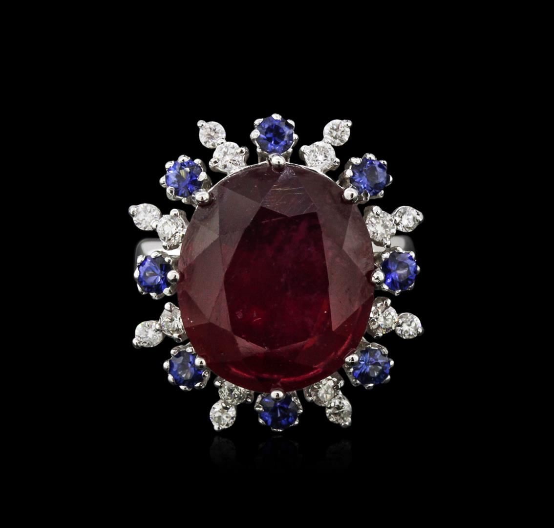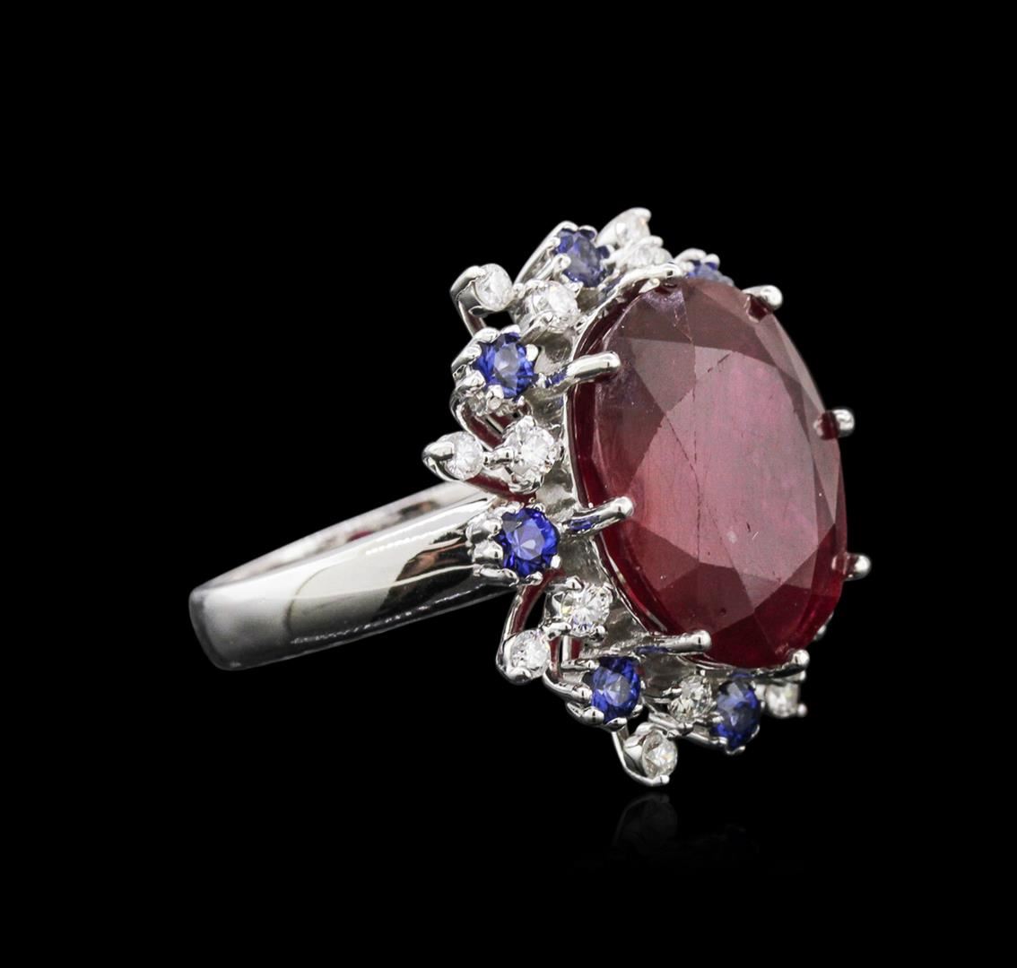 One electronically tested 14KT white gold ladies cast ruby, sapphire and diamond ring with a bright polish finish. Identified with markings of "14K". Condition is new. Containing: One prong set oval modified brilliant cut natural ruby, measuring 15.70 x 13.70 x 8.91mm, approximate weight of 16.30ct., clarity is heavily included, medium, moderately strong, strongly purplish red color, (GIA stpR 5/4), cut is good. Eight prong set round modified brilliant cut natural blue sapphires, measuring 3.60 - 3.60 x 2.34 mm, approximate total weight of 1.92ct., clarity is eye clean, type II, medium, strong, blue color, (GIA B 5/5), cut is good. Sixteen prong set round brilliant cut diamonds, measuring 2.00 - 1.80 x 1.14mm (depth est.) approximate total weight of 16 Stones = 0.40ct. Clarity: SI-1 to I-1. Color: I - J, Cut is Good. Colored gemstones are presumed to have been subjected to commonly used enhancement processes. All diamonds and colored gemstones are graded in the mounting, unless otherwise stated. Total Weight of Colored Stones 18.22ct. Total Weight of Diamonds 0.40ct. Total Weight of Ring 11.20 grams. GGL Appraised at $4,810.00.