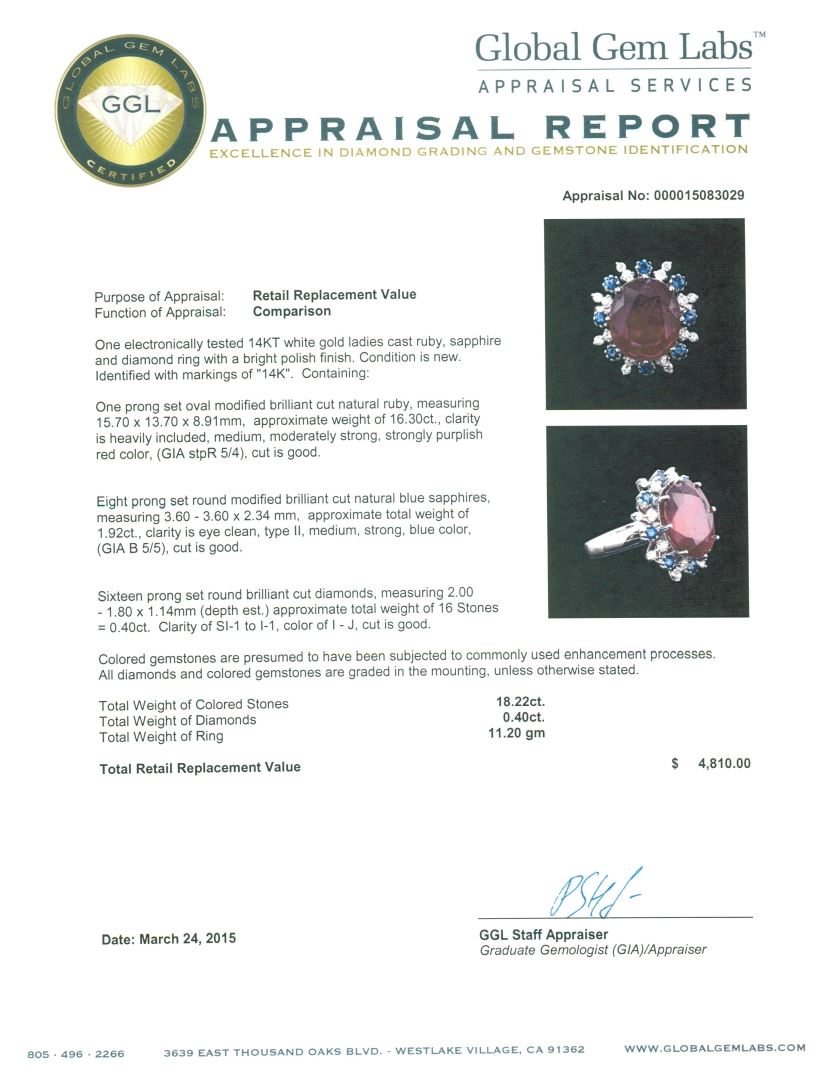 One electronically tested 14KT white gold ladies cast ruby, sapphire and diamond ring with a bright polish finish. Identified with markings of "14K". Condition is new. Containing: One prong set oval modified brilliant cut natural ruby, measuring 15.70 x 13.70 x 8.91mm, approximate weight of 16.30ct., clarity is heavily included, medium, moderately strong, strongly purplish red color, (GIA stpR 5/4), cut is good. Eight prong set round modified brilliant cut natural blue sapphires, measuring 3.60 - 3.60 x 2.34 mm, approximate total weight of 1.92ct., clarity is eye clean, type II, medium, strong, blue color, (GIA B 5/5), cut is good. Sixteen prong set round brilliant cut diamonds, measuring 2.00 - 1.80 x 1.14mm (depth est.) approximate total weight of 16 Stones = 0.40ct. Clarity: SI-1 to I-1. Color: I - J, Cut is Good. Colored gemstones are presumed to have been subjected to commonly used enhancement processes. All diamonds and colored gemstones are graded in the mounting, unless otherwise stated. Total Weight of Colored Stones 18.22ct. Total Weight of Diamonds 0.40ct. Total Weight of Ring 11.20 grams. GGL Appraised at $4,810.00.