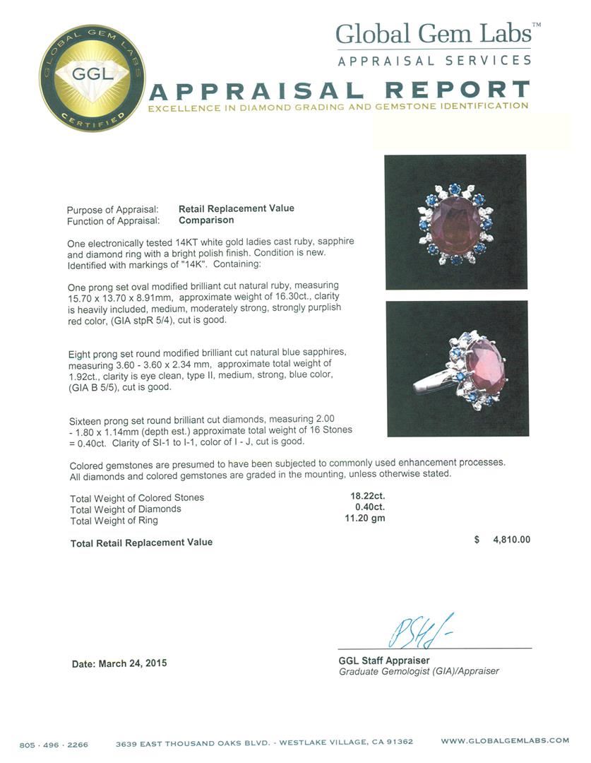 One electronically tested 14KT white gold ladies cast ruby, sapphire and diamond ring with a bright polish finish. Identified with markings of "14K". Condition is new. Containing: One prong set oval modified brilliant cut natural ruby, measuring 15.70 x 13.70 x 8.91mm, approximate weight of 16.30ct., clarity is heavily included, medium, moderately strong, strongly purplish red color, (GIA stpR 5/4), cut is good. Eight prong set round modified brilliant cut natural blue sapphires, measuring 3.60 - 3.60 x 2.34 mm, approximate total weight of 1.92ct., clarity is eye clean, type II, medium, strong, blue color, (GIA B 5/5), cut is good. Sixteen prong set round brilliant cut diamonds, measuring 2.00 - 1.80 x 1.14mm (depth est.) approximate total weight of 16 Stones = 0.40ct. Clarity: SI-1 to I-1. Color: I - J, Cut is Good. Colored gemstones are presumed to have been subjected to commonly used enhancement processes. All diamonds and colored gemstones are graded in the mounting, unless otherwise stated. Total Weight of Colored Stones 18.22ct. Total Weight of Diamonds 0.40ct. Total Weight of Ring 11.20 grams. GGL Appraised at $4,810.00.