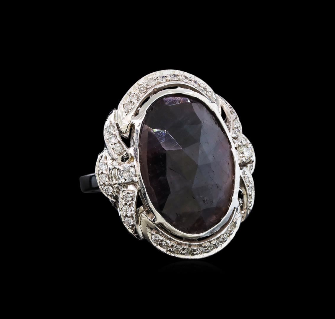 One electronically tested 14KT white gold ladies cast ruby and diamond ring with a bright polish finish. Identified with markings of "14K". Condition is very good. Containing: One bezel set oval modified mixed cut natural ruby, measuring 22.50 x 15.50 x 5.50mm, approximate weight of 16.31ct., clarity is severely included, dark, strong, brown color, (GIA Br 7/5)Forty-One prong set round brilliant cut diamonds, measuring 2.50 - 1.50 x 1.20mm (depth est.) approximate total weight of 41 Stones = 0.50 ct. Clarity: I-1 to I-2. Color: I - J. Colored gemstones are presumed to have been subjected to commonly used enhancement processes. All diamonds and colored gemstones are graded in the mounting, unless otherwise stated. Total Weight of Colored Stones 16.31ct. Total Weight of Diamonds 0.50 ct. Total Weight of Ring 14.50 grams. GGL Appraised.