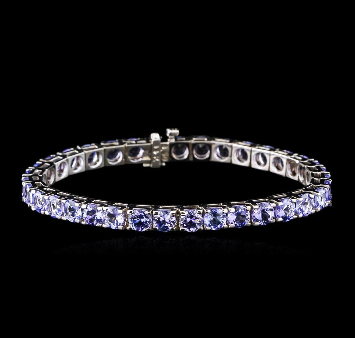 One electronically tested 14KT white gold ladies cast tanzanite bracelet with a hidden box clasp with safety closer with a bright polish finish. 7.25" in length. Identified with markings of "14K". Condition is new. Containing: Thirty-five prong set round modified brilliant cut natural tanzanites, measuring 4.90 - 4.90 x 3.19 mm, approximate total weight of 16.43ct., clarity is eye clean, type I, medium light, very slightly grayish, violet color, (GIA V 4/3), cut is good. Colored gemstones are presumed to have been subjected to commonly used enhancement processes. All colored gemstones are graded in the mounting, unless otherwise stated. Total Weight of Colored Stones 16.43ct. Total Weight of Bracelet 20.20 grams. GGL Appraised at $7,925.00.