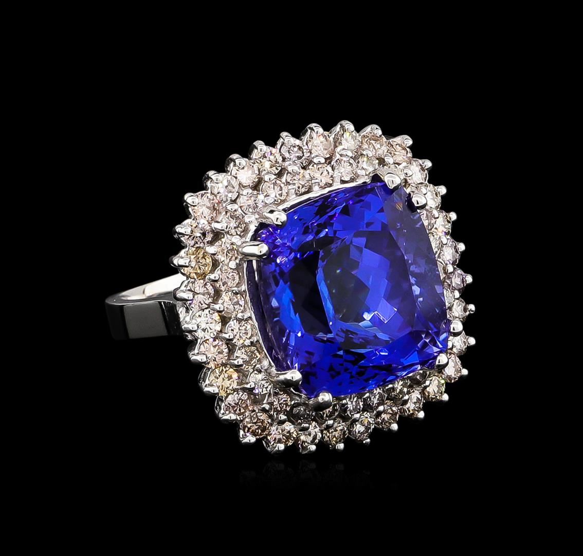 One electronically tested 14KT white gold ladies cast tanzanite and diamond ring with a bright polish finish. Condition is new, good workmanship. The featured tanzanite is set within tiered diamond bezels, completed by a two and one-half millimeter wide band. Identified with markings of "K14". Containing: One prong set cushion modified brilliant cut natural tanzanite, measuring 13.93 x 13.25 x 11.20mm, exact weight 16.51 ct., clarity is eye clean, type I, medium dark, very slightly grayish, violetish blue color, (GIA vB 6/3), cut is good. Transmitting light with no distortion, transparent. GIA Colored Stone Grading Report attached. Graded loose prior to setting in the GIA Laboratory, Report #2151735594. Tanzanite is a very rare gemstone that is only found in the country of Tanzania. Originally discovered in 1967. Tiffany & Company, named the stone Tanzanite. It is found in the Usumburu Mountains that border the Umba Valley of northern Tanzania. Tanzanite occurs in gray, brown, violet, blue, reddish-purple, & green. The gem is interesting because of its exceptional pleochroism. Rotated in different directions a tanzanite will exhibit multiple changes of color. Tanzanite has a low tolerance to ultrasonic cleaning, and should not be cleaned using this method. Sixty prong set round brilliant cut diamonds, measuring 2.10 - 1.90 x 1.20mm (depth est.) approximate total weight of 60 Stones = 1.94ct. Color grade is an average for the group. Graded in the setting. Clarity SI-1 to I-1. Color Very Light Brown. Total Weight of Colored Stones 16.51ct. Total Weight of Diamonds 1.94ct. Total Weight of Ring 12.88gm. AIG Appraised at $46,790.00.