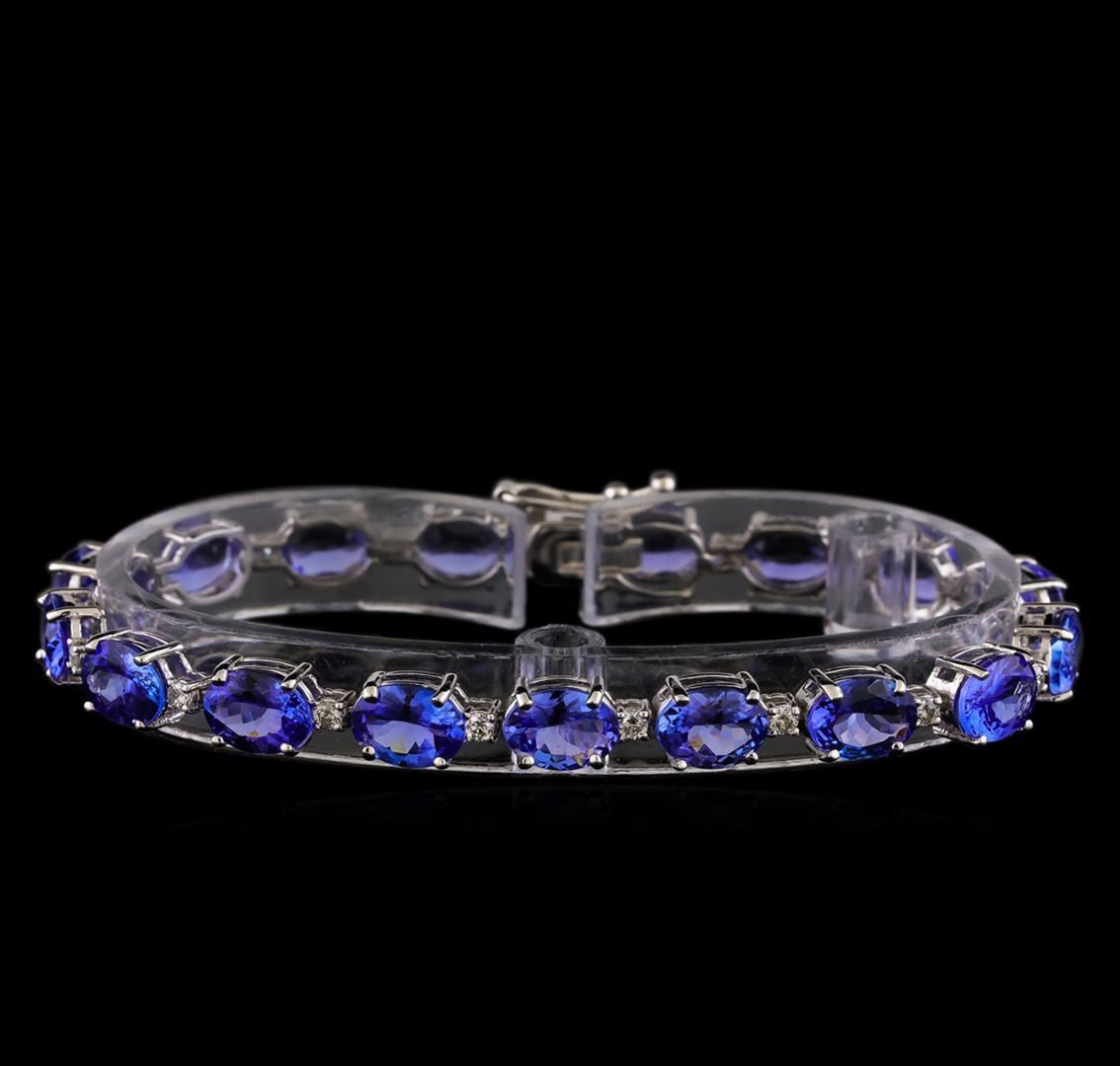 One electronically tested 14KT white gold ladies combination cast & assembled tanzanite and diamond bracelet with a hidden box clasp with a bright polish finish. Measurements: 7" in length. Condition is new. Containing: Seventeen prong set oval modified brilliant cut natural tanzanites, measuring 7.65 x 6.12 x 3.08mm, approximate total weight of 16.66ct., clarity is eye clean, type I, medium, moderately strong, violet color, (GIA V 5/4), cut is good. Seventeen prong set round brilliant cut diamonds, measuring 2.00 - 2.00 x 1.20mm (depth est.) approximate total weight of 17 Stones = 0.50ct. Clarity: SI-1 to SI-2. Color: I - J, Cut is Good. Colored gemstones are presumed to have been subjected to commonly used enhancement processes. All diamonds and colored gemstones are graded in the mounting, unless otherwise stated. Total Weight of Colored Stones 16.66ct. Total Weight of Diamonds 0.50ct. Total Weight of Bracelet 12.90 grams. GGL Appraised at $12,710.00.