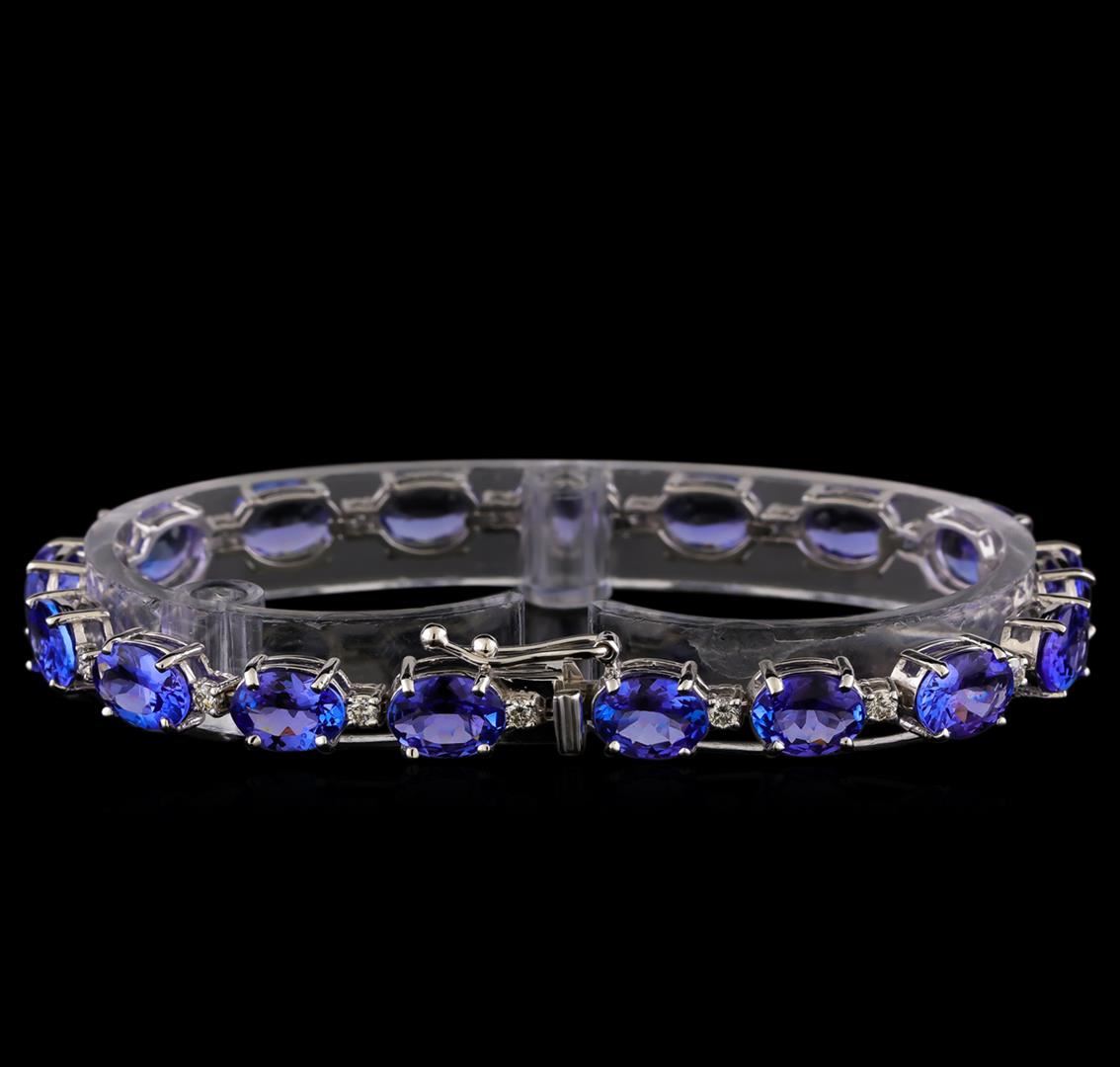 One electronically tested 14KT white gold ladies combination cast & assembled tanzanite and diamond bracelet with a hidden box clasp with a bright polish finish. Measurements: 7" in length. Condition is new. Containing: Seventeen prong set oval modified brilliant cut natural tanzanites, measuring 7.65 x 6.12 x 3.08mm, approximate total weight of 16.66ct., clarity is eye clean, type I, medium, moderately strong, violet color, (GIA V 5/4), cut is good. Seventeen prong set round brilliant cut diamonds, measuring 2.00 - 2.00 x 1.20mm (depth est.) approximate total weight of 17 Stones = 0.50ct. Clarity: SI-1 to SI-2. Color: I - J, Cut is Good. Colored gemstones are presumed to have been subjected to commonly used enhancement processes. All diamonds and colored gemstones are graded in the mounting, unless otherwise stated. Total Weight of Colored Stones 16.66ct. Total Weight of Diamonds 0.50ct. Total Weight of Bracelet 12.90 grams. GGL Appraised at $12,710.00.