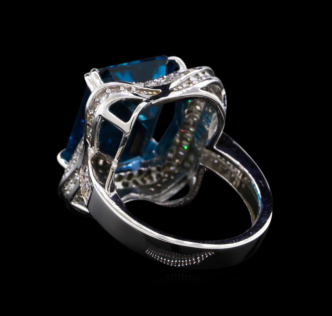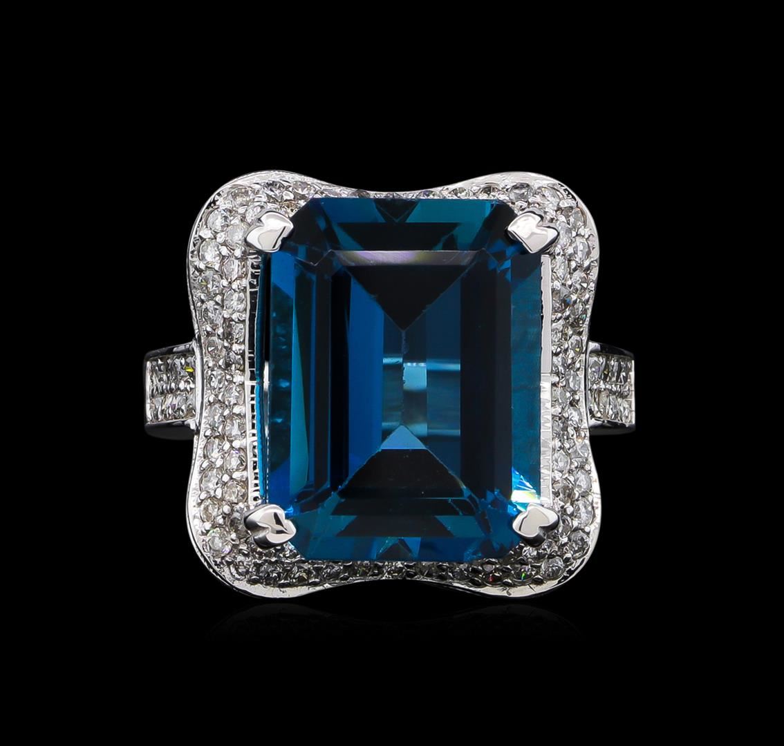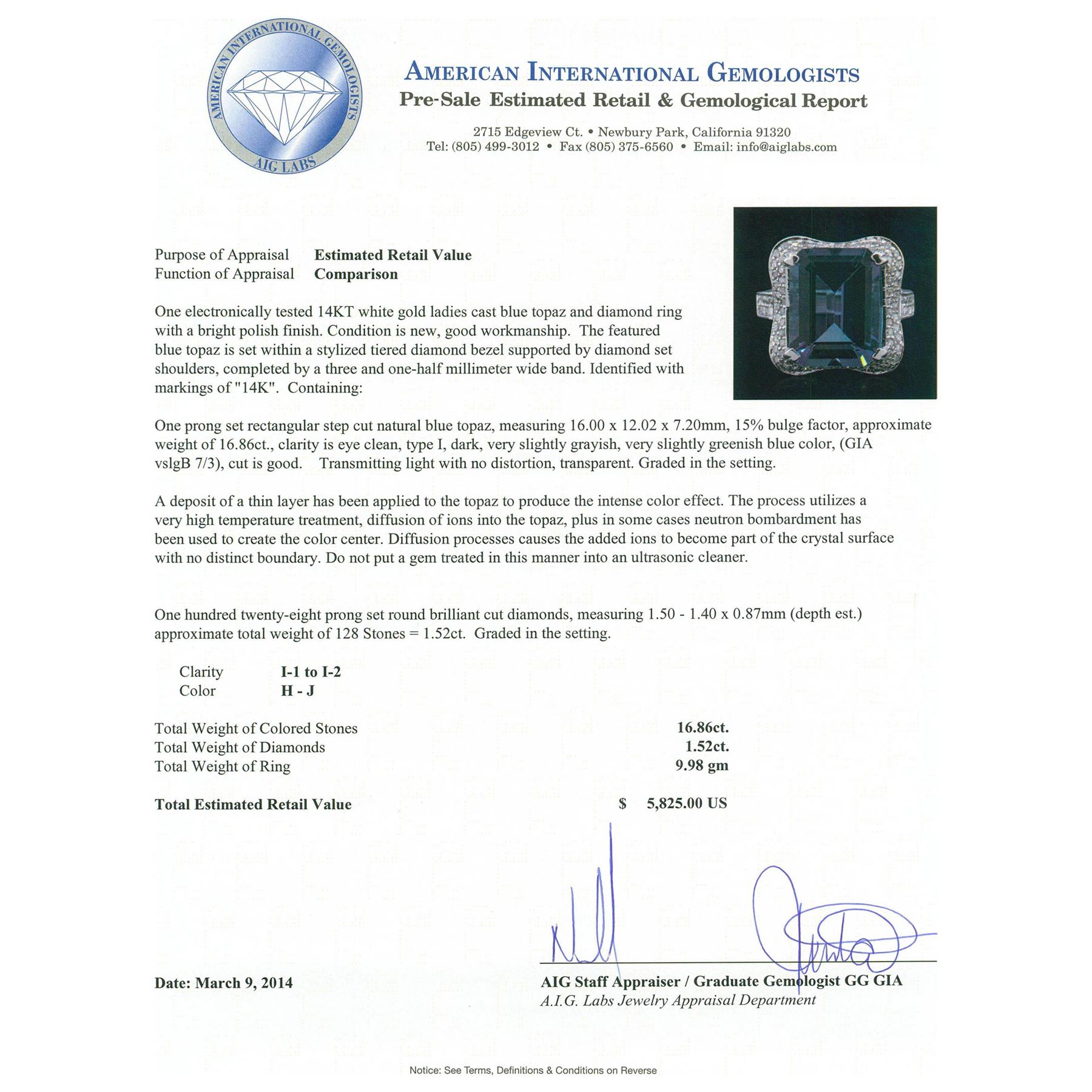 One electronically tested 14KT white gold ladies cast blue topaz and diamond ring with a bright polish finish. The featured blue topaz is set within a stylized tiered diamond bezel supported by diamond set shoulders, completed by a three and one-half millimeter wide band. Identified with markings of "14K". Condition is new, good workmanship. Containing: One prong set rectangular step cut natural blue topaz, measuring 16.00 x 12.02 x 7.20mm, 15%. bulge factor, approximate weight of 16.86ct., clarity is eye clean, type I, dark, very slightly grayish, very slightly greenish blue color, (GIA vslgB 7/3), cut is good. Transmitting light with no distortion, transparent. Graded in the setting. A deposit of a thin layer has been applied to the topaz to produce the intense color effect. The process utilizes a very high temperature treatment, diffusion of ions into the topaz, plus in some cases neutron bombardment has been used to create the color center. Diffusion processes causes the added ions to become part of the crystal surface with no distinct boundary. Do not put a gem treated in this manner into an ultrasonic cleaner. One Hundred Twenty-Eight prong set round brilliant cut diamonds, measuring 1.50 - 1.40 x 0.87mm (depth est.) approximate. Total Weight of 128 Stones = 1.52ct. Graded in the setting. Clarity: I-1 to I-2. Color: H - J. Total Weight of Colored Stones 16.86ct. Total Weight of Diamonds 1.52ct. AIG Appraised at $5,825.00.