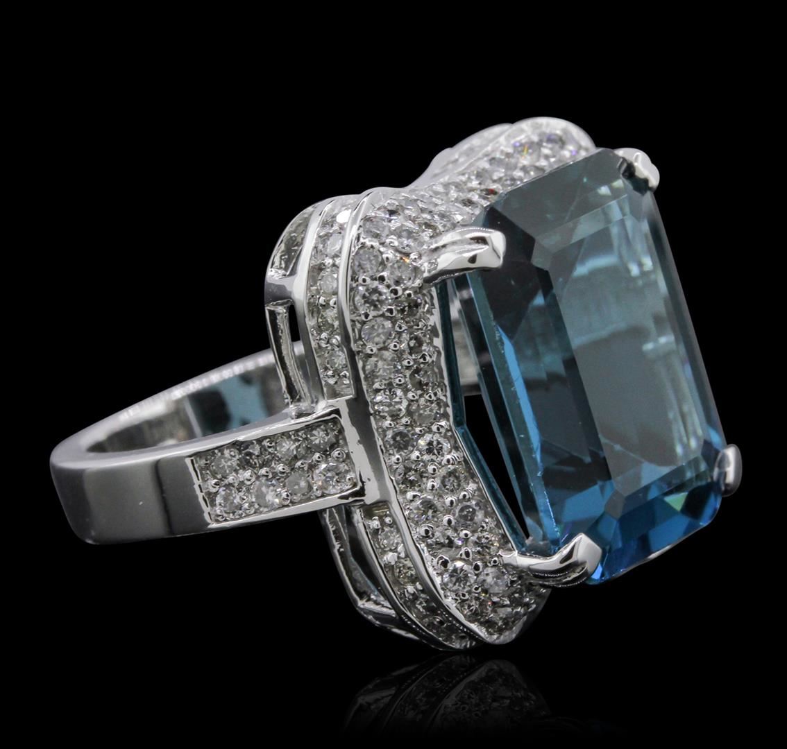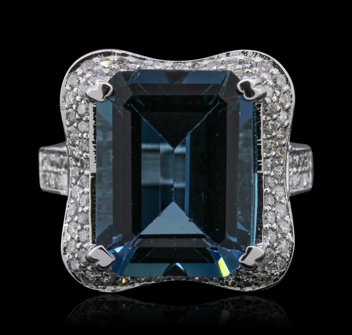 One electronically tested 14KT white gold ladies cast blue topaz and diamond ring with a bright polish finish. The featured blue topaz is set within a stylized tiered diamond bezel supported by diamond set shoulders, completed by a three and one-half millimeter wide band. Identified with markings of "14K". Condition is new, good workmanship. Containing: One prong set rectangular step cut natural blue topaz, measuring 16.00 x 12.02 x 7.20mm, 15%. bulge factor, approximate weight of 16.86ct., clarity is eye clean, type I, dark, very slightly grayish, very slightly greenish blue color, (GIA vslgB 7/3), cut is good. Transmitting light with no distortion, transparent. Graded in the setting. A deposit of a thin layer has been applied to the topaz to produce the intense color effect. The process utilizes a very high temperature treatment, diffusion of ions into the topaz, plus in some cases neutron bombardment has been used to create the color center. Diffusion processes causes the added ions to become part of the crystal surface with no distinct boundary. Do not put a gem treated in this manner into an ultrasonic cleaner. One Hundred Twenty-Eight prong set round brilliant cut diamonds, measuring 1.50 - 1.40 x 0.87mm (depth est.) approximate. Total Weight of 128 Stones = 1.52ct. Graded in the setting. Clarity: I-1 to I-2. Color: H - J. Total Weight of Colored Stones 16.86ct. Total Weight of Diamonds 1.52ct. AIG Appraised at $5,825.00.