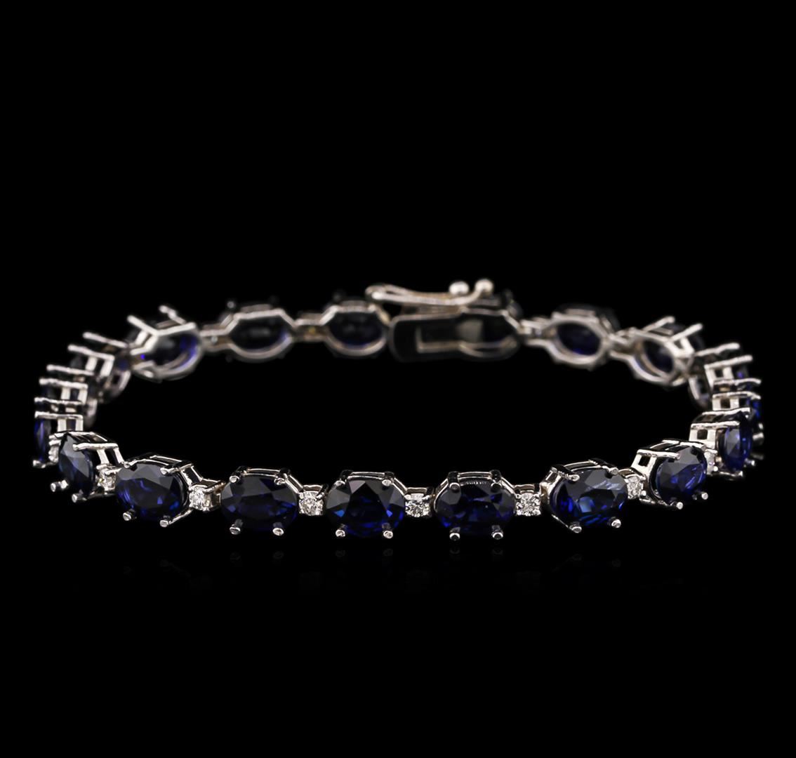 One electronically tested 14KT white gold ladies cast sapphire and diamond bracelet with a hidden box clasp with safety closer with a bright polish finish. Measurements: 7" in length Identified with markings of "14K". Condition is new. Containing: Nineteen prong set oval modified brilliant cut natural blue sapphires, measuring 7.00 x 5.00 x 3.25mm, approximate total weight of 16.95ct., clarity is eye clean, type II, medium, moderately strong, blue color, (GIA B 5/4), cut is good. Nineteen prong set round brilliant cut diamonds, measuring 2.00 - 2.00 x 1.20mm (depth est.) approximate total weight of 19 Stones = 0.67ct. Clarity: SI-1 to SI-2. Color: I - J, Cut is Good. Colored gemstones are presumed to have been subjected to commonly used enhancement processes. All diamonds and colored gemstones are graded in the mounting, unless otherwise stated. Total Weight of Colored Stones 16.95ct. Total Weight of Diamonds 0.67ct. Total Weight of Bracelet 12.00 grams. GGL Appraised.