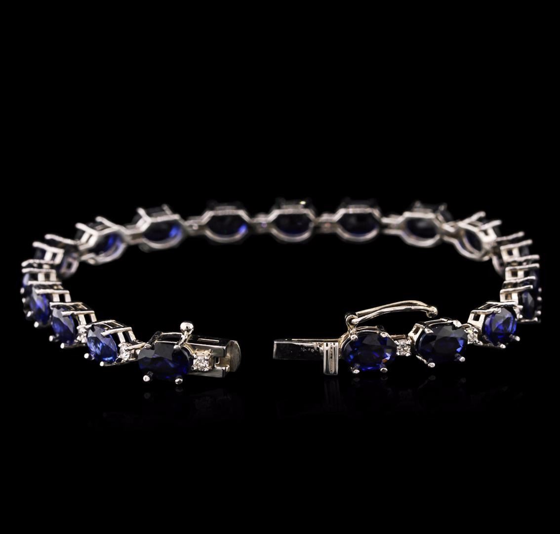 One electronically tested 14KT white gold ladies cast sapphire and diamond bracelet with a hidden box clasp with safety closer with a bright polish finish. Measurements: 7" in length Identified with markings of "14K". Condition is new. Containing: Nineteen prong set oval modified brilliant cut natural blue sapphires, measuring 7.00 x 5.00 x 3.25mm, approximate total weight of 16.95ct., clarity is eye clean, type II, medium, moderately strong, blue color, (GIA B 5/4), cut is good. Nineteen prong set round brilliant cut diamonds, measuring 2.00 - 2.00 x 1.20mm (depth est.) approximate total weight of 19 Stones = 0.67ct. Clarity: SI-1 to SI-2. Color: I - J, Cut is Good. Colored gemstones are presumed to have been subjected to commonly used enhancement processes. All diamonds and colored gemstones are graded in the mounting, unless otherwise stated. Total Weight of Colored Stones 16.95ct. Total Weight of Diamonds 0.67ct. Total Weight of Bracelet 12.00 grams. GGL Appraised at $4,355.00.