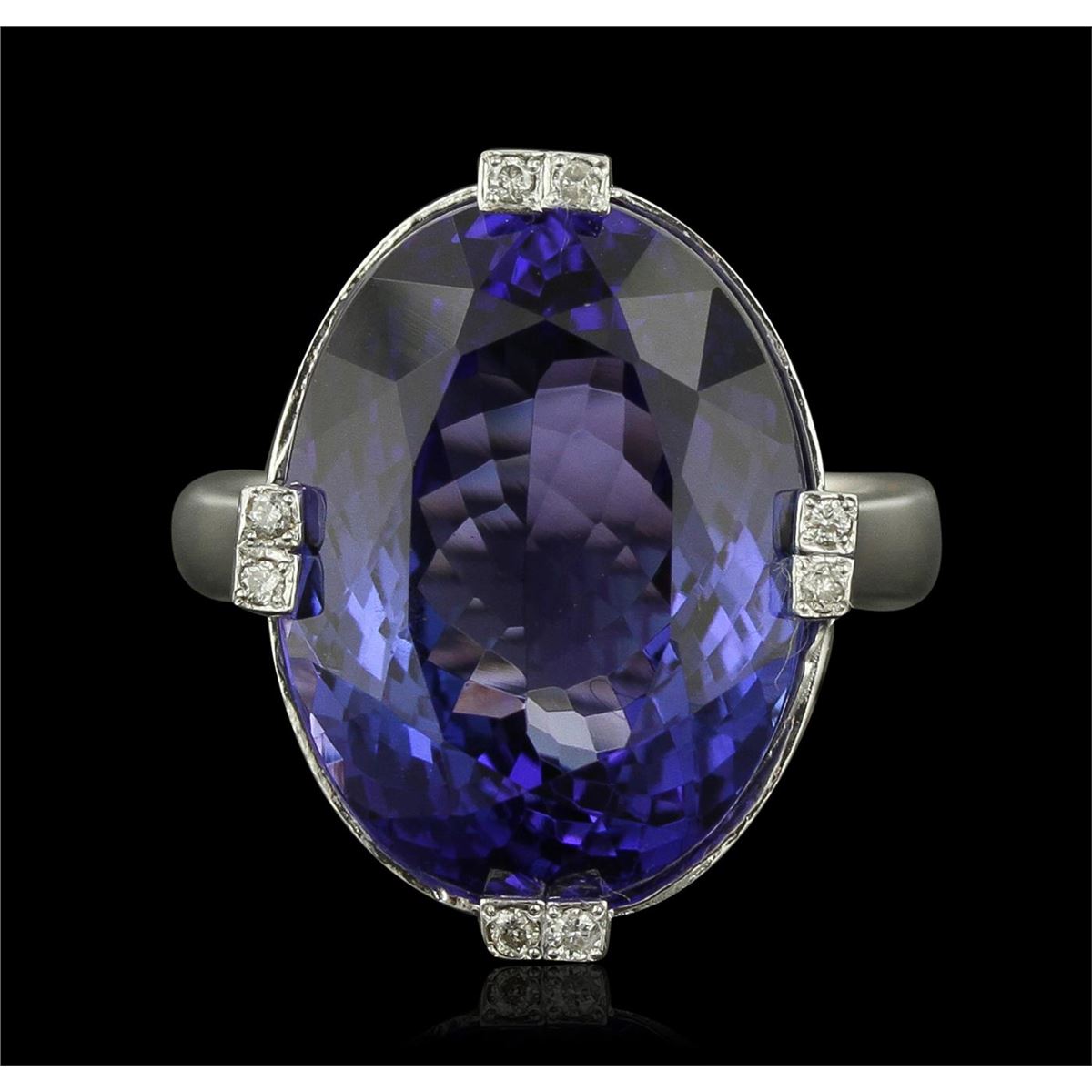 One electronically tested 14KT white gold Ladies combination cast & assembled ring with a high polish finish. Condition is new. Identified with markings of "14K". Containing: One prong set oval modified mixed cut natural tanzanite, measuring 18.00 x 14.00 x 9.10mm, approximate weight of 16.98ct., clarity is eye clean, type I, medium, moderately strong, bluish violet color, (GIA bV 5/4), cut is very good. Colored gemstones are presumed to have been subjected to commonly used color/clarity enhancement processes. Eight prong set round brilliant cut diamonds, measuring 1.00 - 1.00 x 0.66mm (depth est.) approximate. Total Weight of 8 Stones = 0.06ct. Clarity: I-1 to I-2. Color: H - I, Cut is Good. Total Weight of Colored Stones 16.98ct. Total Weight of Diamonds 0.06ct. Total Weight of Ring 8.70 grams. GGL Appraised at $20,385.00.