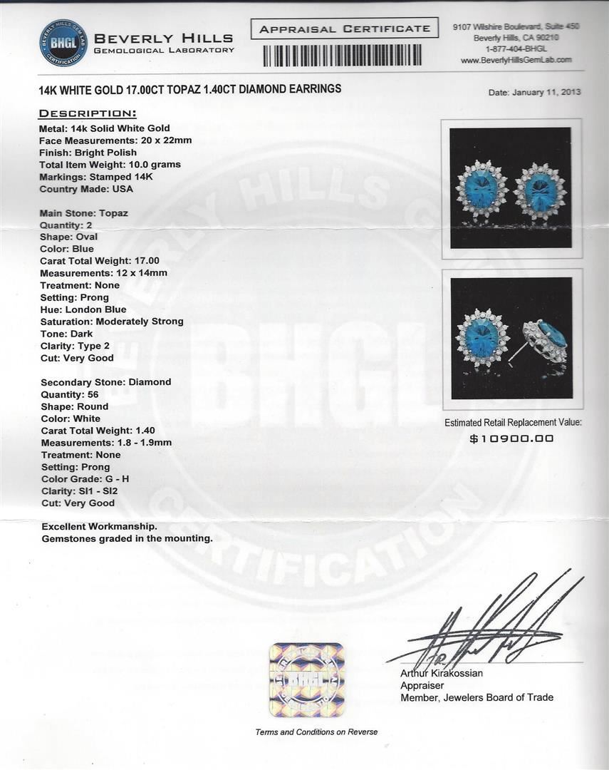 One pair of earrings featuring: Metal: 14k Solid White Gold. Face Measurements: 20 x 22mm. Size: 7. Finish: Bright Polish. Total Item Weight: 10.0 grams. Markings: Stamped 14K. Country Made: USA. Main Stone: Topaz. Quantity: 2. Shape: Oval. Color: Blue. Carat Total Weight: 17.00. Measurements: 12 x 14mm. Treatment: None. Setting: Prong. Hue: London Blue. Saturation: Moderately Strong. Tone: Dark. Clarity: Type 2. Cut: Very Good. Secondary Stone: Diamond. Quantity: 56. Shape: Round. Color: White. Carat Total Weight: 1.40. Measurements: 1.8 - 1.9mm. Treatment: None. Setting: Prong. Color Grade: G - H. Clarity: SI1 - SI2. Cut: Very Good. Excellent Workmanship. Gemstones graded in the mounting. BHGL Appraised at $10,900.00.