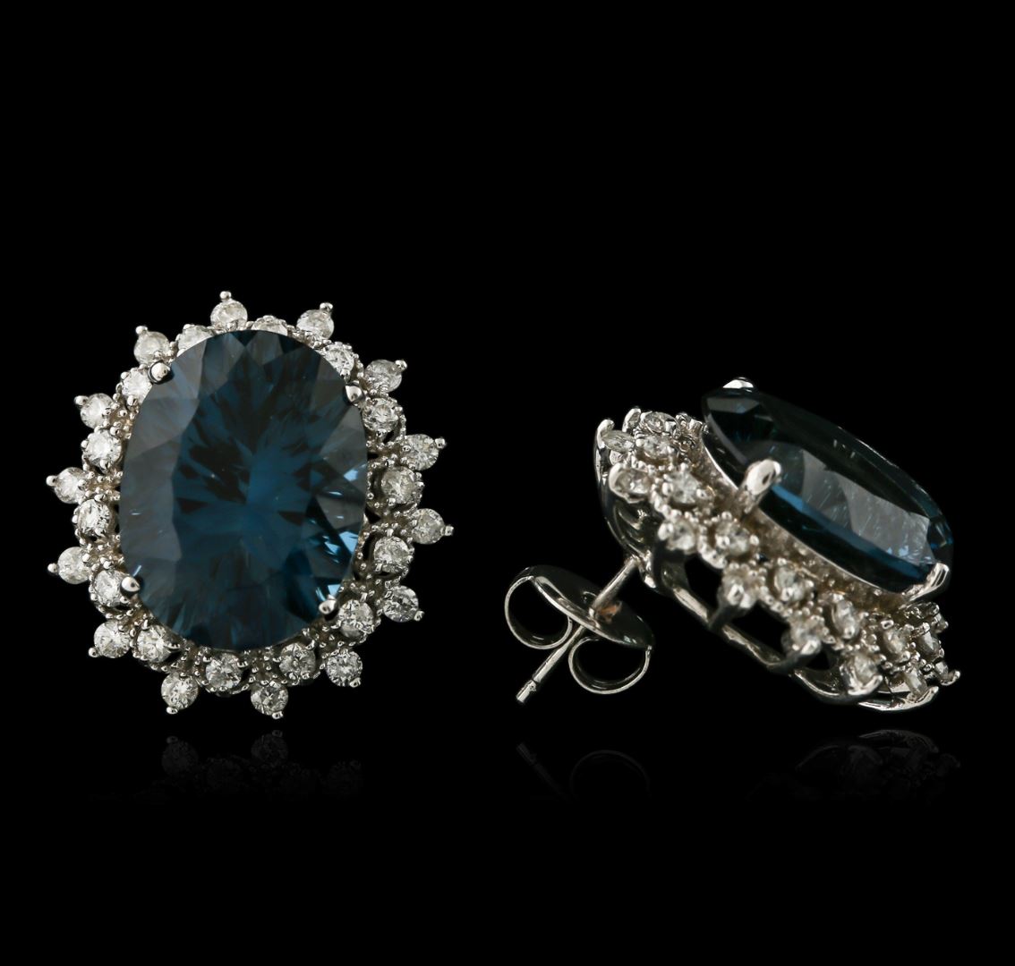 One pair of earrings featuring: Metal: 14k Solid White Gold. Face Measurements: 20 x 22mm. Size: 7. Finish: Bright Polish. Total Item Weight: 10.0 grams. Markings: Stamped 14K. Country Made: USA. Main Stone: Topaz. Quantity: 2. Shape: Oval. Color: Blue. Carat Total Weight: 17.00. Measurements: 12 x 14mm. Treatment: None. Setting: Prong. Hue: London Blue. Saturation: Moderately Strong. Tone: Dark. Clarity: Type 2. Cut: Very Good. Secondary Stone: Diamond. Quantity: 56. Shape: Round. Color: White. Carat Total Weight: 1.40. Measurements: 1.8 - 1.9mm. Treatment: None. Setting: Prong. Color Grade: G - H. Clarity: SI1 - SI2. Cut: Very Good. Excellent Workmanship. Gemstones graded in the mounting. BHGL Appraised at $10,900.00.