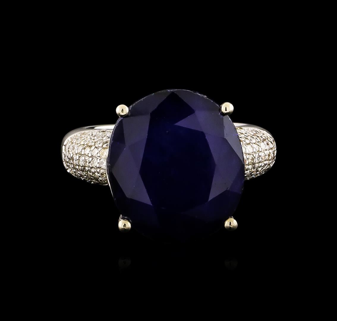 One electronically tested 14KT white gold ladies cast dyed sapphire and diamond ring with a bright polish finish. Condition is new, good workmanship. The featured dyed sapphire is supported by diamond set shoulders, completed by a three millimeter wide band. Identified with markings of "K14". Containing: One prong set oval mixed cut natural dyed sapphire, measuring 16.50 x 14.50 x 8.20mm, 8%. bulge factor, approximate weight of 17.02ct., clarity is severely included, dark, very slightly grayish, blue color, (GIA B 7/3), cut is good. Transmitting light very diffusely, opaque. Naturally occurring internal & external characteristics are present. Indications of multiple laboratory enhancements, including high temperature heat treatment and dye. Graded in the setting. Ninety-Six pav, set round brilliant cut diamonds, measuring 1.20 - 1.10 x 0.69mm (depth est.) approximate. Total Weight of 96 Stones = 0.62ct. Graded in the setting. Clarity: SI-1 to I-1. Color: H - J. Total Weight of Colored Stones 17.02ct. Total Weight of Diamonds 0.62ct. Total Weight of Ring 8.77 grams. AIG Appraised at $3,825.00.