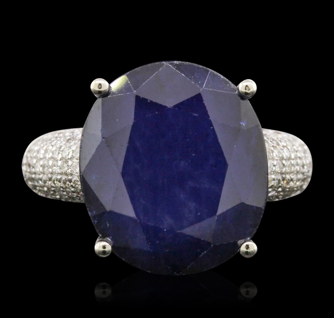 One electronically tested 14KT white gold ladies cast dyed sapphire and diamond ring with a bright polish finish. Condition is new, good workmanship. The featured dyed sapphire is supported by diamond set shoulders, completed by a three millimeter wide band. Identified with markings of "K14". Containing: One prong set oval mixed cut natural dyed sapphire, measuring 16.50 x 14.50 x 8.20mm, 8%. bulge factor, approximate weight of 17.02ct., clarity is severely included, dark, very slightly grayish, blue color, (GIA B 7/3), cut is good. Transmitting light very diffusely, opaque. Naturally occurring internal & external characteristics are present. Indications of multiple laboratory enhancements, including high temperature heat treatment and dye. Graded in the setting. Ninety-Six pav, set round brilliant cut diamonds, measuring 1.20 - 1.10 x 0.69mm (depth est.) approximate. Total Weight of 96 Stones = 0.62ct. Graded in the setting. Clarity: SI-1 to I-1. Color: H - J. Total Weight of Colored Stones 17.02ct. Total Weight of Diamonds 0.62ct. Total Weight of Ring 8.77 grams. AIG Appraised at $3,825.00.