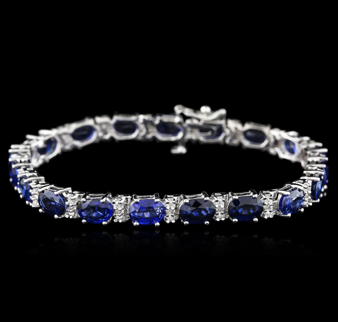 One electronically tested 14KT white gold ladies cast sapphire and diamond bracelet with a hidden box clasp with safety closer with a bright polish finish. Measurements: 6.75" in length Identified with markings of "14K". Condition is new. Containing: Nineteen prong set oval modified brilliant cut natural blue sapphires, measuring 6.83 x 5.27 x 3.43mm, approximate total weight of 17.15ct., clarity is slightly included, type II, medium light, very slightly grayish, blue color, (GIA B 4/3), cut is good. Thirty-Eight prong set round brilliant cut diamonds, measuring 1.50 - 1.50 x 0.90mm (depth est.) approximate total weight of 38 Stones = 0.58ct. Clarity: SI-1 to I-1. Color: H - I, Cut is Good. All diamonds and colored gemstones are graded in the mounting, unless otherwise stated. Colored gemstones are presumed to have been subjected to commonly used enhancement processes. Total Weight of Colored Stones 17.15ct. Total Weight of Diamonds 0.58ct. Total Weight of Bracelet 14.90 grams. GGL Appraised at $9,910.00.