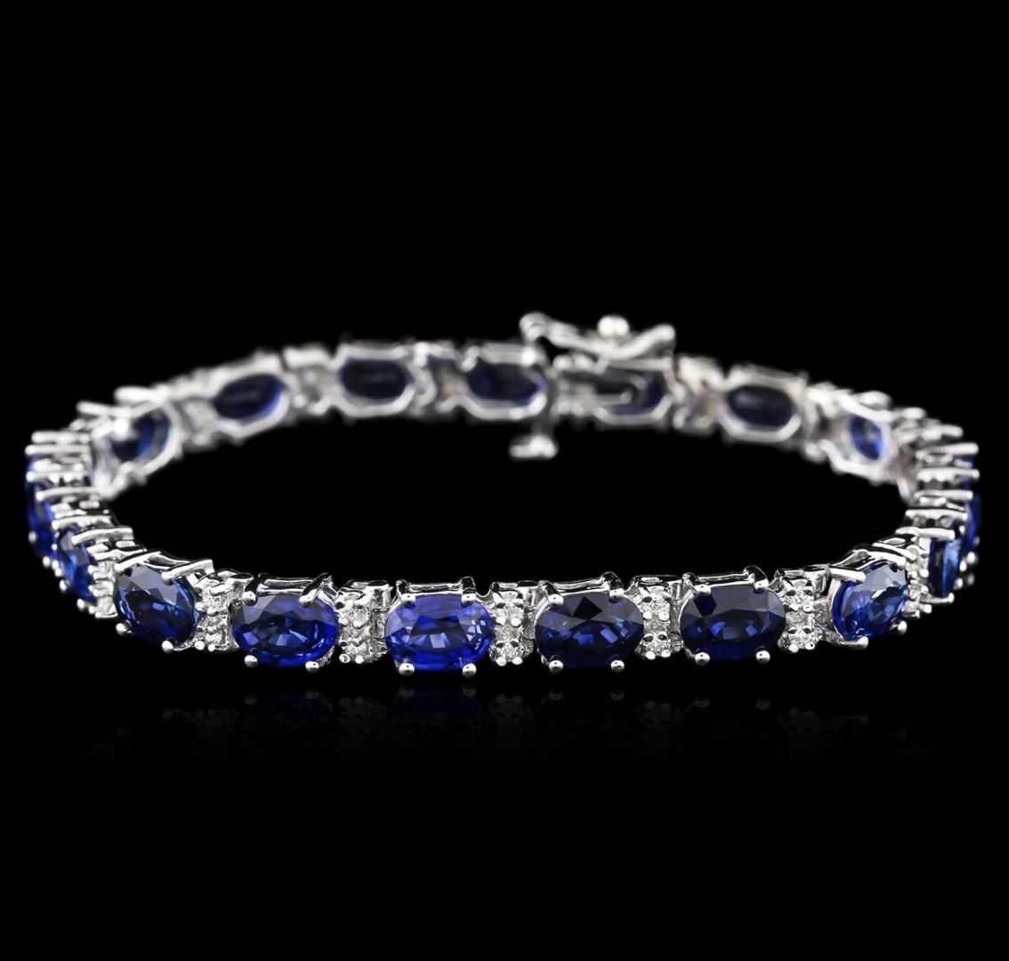 One electronically tested 14KT white gold ladies cast sapphire and diamond bracelet with a hidden box clasp with safety closer with a bright polish finish. Measurements: 6.75" in length Identified with markings of "14K". Condition is new. Containing: Nineteen prong set oval modified brilliant cut natural blue sapphires, measuring 6.83 x 5.27 x 3.43mm, approximate total weight of 17.15ct., clarity is slightly included, type II, medium light, very slightly grayish, blue color, (GIA B 4/3), cut is good. Thirty-Eight prong set round brilliant cut diamonds, measuring 1.50 - 1.50 x 0.90mm (depth est.) approximate total weight of 38 Stones = 0.58ct. Clarity: SI-1 to I-1. Color: H - I, Cut is Good. All diamonds and colored gemstones are graded in the mounting, unless otherwise stated. Colored gemstones are presumed to have been subjected to commonly used enhancement processes. Total Weight of Colored Stones 17.15ct. Total Weight of Diamonds 0.58ct. Total Weight of Bracelet 14.90 grams. GGL Appraised at $9,910.00.