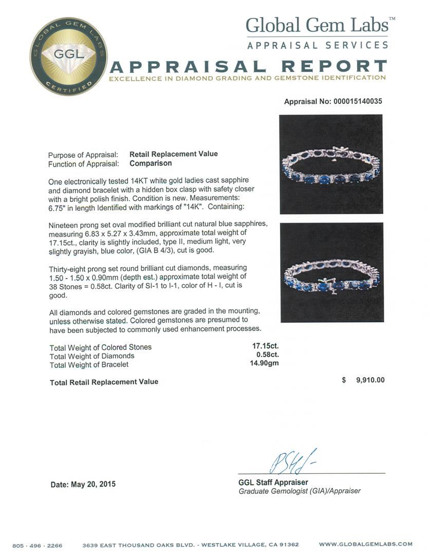 One electronically tested 14KT white gold ladies cast sapphire and diamond bracelet with a hidden box clasp with safety closer with a bright polish finish. Measurements: 6.75" in length Identified with markings of "14K". Condition is new. Containing: Nineteen prong set oval modified brilliant cut natural blue sapphires, measuring 6.83 x 5.27 x 3.43mm, approximate total weight of 17.15ct., clarity is slightly included, type II, medium light, very slightly grayish, blue color, (GIA B 4/3), cut is good. Thirty-Eight prong set round brilliant cut diamonds, measuring 1.50 - 1.50 x 0.90mm (depth est.) approximate total weight of 38 Stones = 0.58ct. Clarity: SI-1 to I-1. Color: H - I, Cut is Good. All diamonds and colored gemstones are graded in the mounting, unless otherwise stated. Colored gemstones are presumed to have been subjected to commonly used enhancement processes. Total Weight of Colored Stones 17.15ct. Total Weight of Diamonds 0.58ct. Total Weight of Bracelet 14.90 grams. GGL Appraised at $9,910.00.