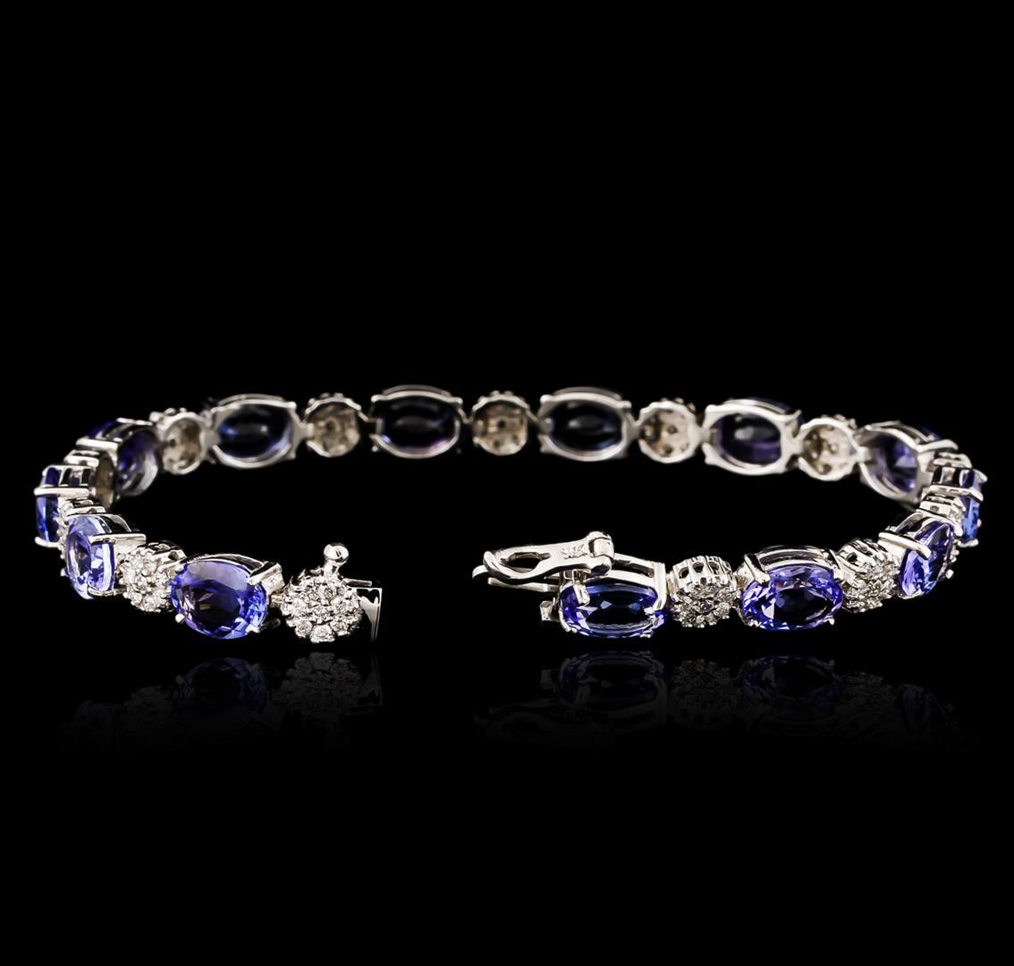 One electronically tested 14KT white gold ladies cast tanzanite and diamond bracelet with a hidden box clasp with safety closer with a bright polish finish. Measurements: 7" in length. Identified with markings of "14K". Condition is new. Containing: Thirteen prong set oval modified brilliant cut natural tanzanites, measuring 8.00. x 6.00. x 3.90mm, approximate total weight of 17.16ct., clarity is eye clean, type I, medium light, very slightly grayish, violet color, (GIA V 4/3), cut is good. One Hundred Four prong set round brilliant cut diamonds, measuring 1.30 - 1.30 x 0.78mm (depth est.) approximate total weight of 104 Stones = 0.83ct. Clarity: SI-2 to I-1. Color: I - J, Cut is Good. Colored gemstones are presumed to have been subjected to commonly used enhancement processes. All diamonds and colored gemstones are graded in the mounting, unless otherwise stated. Total Weight of Colored Stones 17.16ct. Total Weight of Diamonds 0.83ct. Total Weight of Bracelet 15.00 grams. GGL Appraised at $7,700.00.