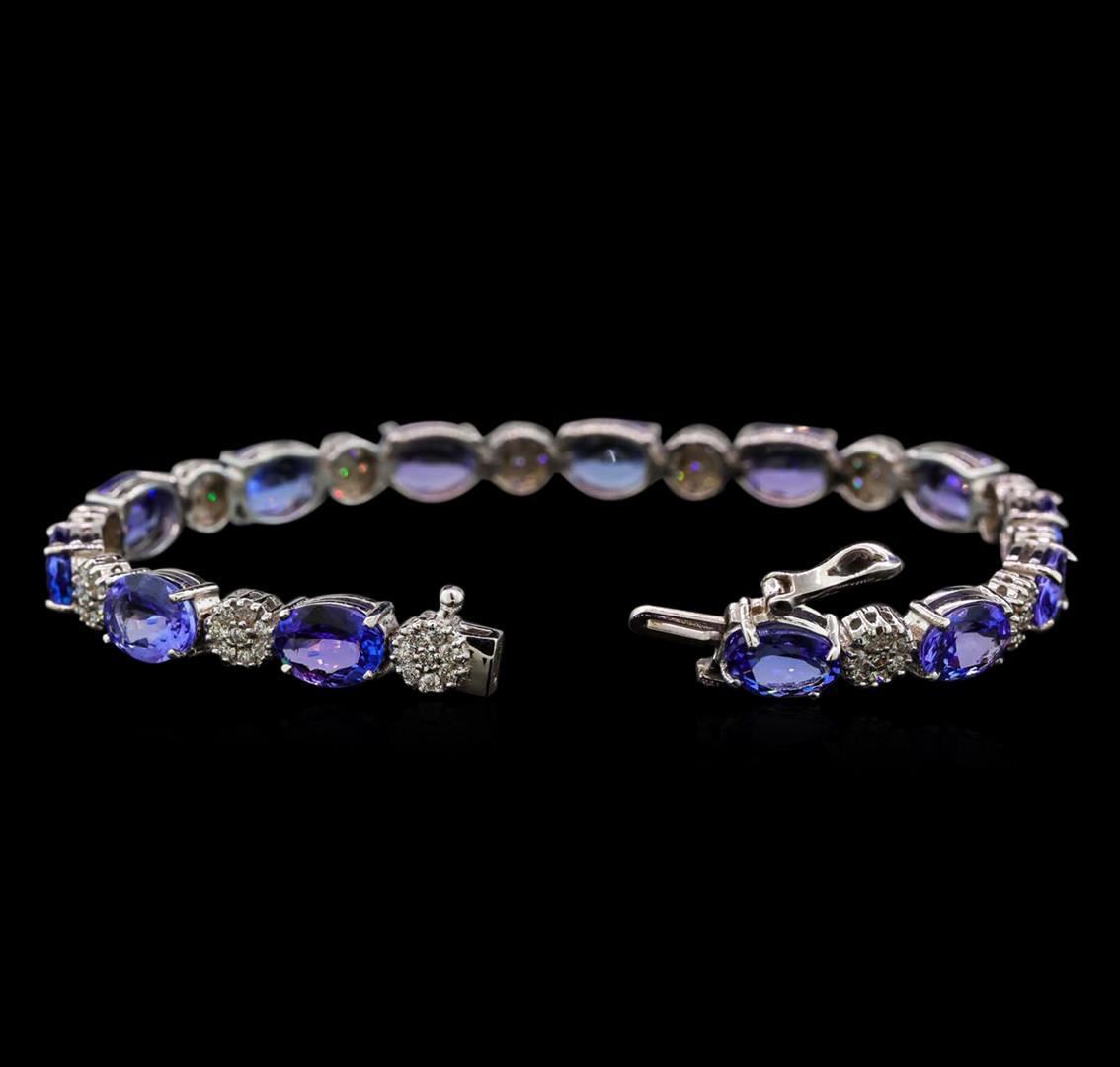 One electronically tested 14KT white gold ladies cast tanzanite and diamond bracelet with a hidden box clasp with safety closer with a bright polish finish. Measurements: 7" in length. Identified with markings of "14K". Condition is new. Containing: Thirteen prong set oval modified brilliant cut natural tanzanites, measuring 8.00. x 6.00. x 3.90mm, approximate total weight of 17.16ct., clarity is eye clean, type I, medium light, very slightly grayish, violet color, (GIA V 4/3), cut is good. One Hundred Four prong set round brilliant cut diamonds, measuring 1.30 - 1.30 x 0.78mm (depth est.) approximate total weight of 104 Stones = 0.83ct. Clarity: SI-2 to I-1. Color: I - J, Cut is Good. Colored gemstones are presumed to have been subjected to commonly used enhancement processes. All diamonds and colored gemstones are graded in the mounting, unless otherwise stated. Total Weight of Colored Stones 17.16ct. Total Weight of Diamonds 0.83ct. Total Weight of Bracelet 15.00 grams. GGL Appraised.