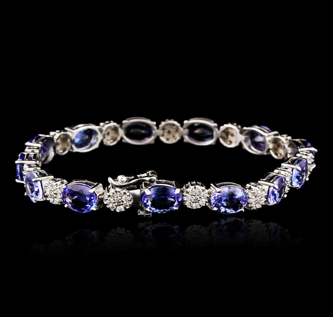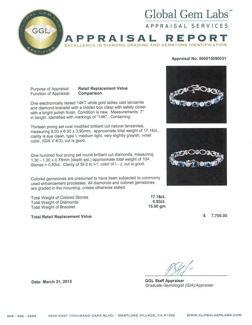 One electronically tested 14KT white gold ladies cast tanzanite and diamond bracelet with a hidden box clasp with safety closer with a bright polish finish. Measurements: 7" in length. Identified with markings of "14K". Condition is new. Containing: Thirteen prong set oval modified brilliant cut natural tanzanites, measuring 8.00. x 6.00. x 3.90mm, approximate total weight of 17.16ct., clarity is eye clean, type I, medium light, very slightly grayish, violet color, (GIA V 4/3), cut is good. One Hundred Four prong set round brilliant cut diamonds, measuring 1.30 - 1.30 x 0.78mm (depth est.) approximate total weight of 104 Stones = 0.83ct. Clarity: SI-2 to I-1. Color: I - J, Cut is Good. Colored gemstones are presumed to have been subjected to commonly used enhancement processes. All diamonds and colored gemstones are graded in the mounting, unless otherwise stated. Total Weight of Colored Stones 17.16ct. Total Weight of Diamonds 0.83ct. Total Weight of Bracelet 15.00 grams. GGL Appraised at $7,700.00.