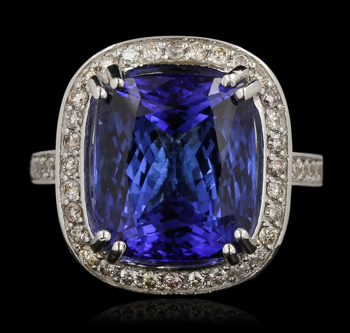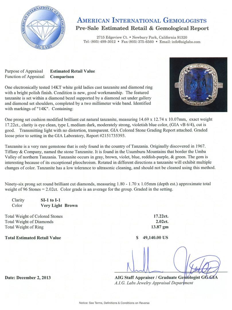 Great Condition! JU50001KF. One electronically tested 14KT white gold ladies cast tanzanite and diamond ring with a bright polish finish. Condition is new, good workmanship. The featured tanzanite is set within a diamond bezel supported by a diamond set under gallery and diamond set shoulders, completed by a two millimeter wide band. Identified with markings of "14K". Containing: One prong set cushion modified brilliant cut natural tanzanite, measuring 14.69 x 12.74 x 10.07mm, exact weight 17.22ct., clarity is eye clean, type I, medium dark, moderately strong, violetish blue color, (GIA vB 6/4), cut is good. Transmitting light with no distortion, transparent. GIA Colored Stone Grading Report attached. Graded loose prior to setting in the GIA Laboratory, Report #2151735393. Tanzanite is a very rare gemstone that is only found in the country of Tanzania. Originally discovered in 1967. Tiffany & Company, named the stone Tanzanite. It is found in the Usumburu Mountains that border the Umba Valley of northern Tanzania. Tanzanite occurs in gray, brown, violet, blue, reddish-purple, & green. The gem is interesting because of its exceptional pleochroism. Rotated in different directions a tanzanite will exhibit multiple changes of color. Tanzanite has a low tolerance to ultrasonic cleaning, and should not be cleaned using this method. Ninety-six prong set round brilliant cut diamonds, measuring 1.80 - 1.70 x 1.05mm (depth est.) approximate total weight of 96 Stones = 2.02ct. Color grade is an average for the group. Graded in the setting. Clarity SI-1 to I-1. Color Very Light Brown. Total Weight of Colored Stones 17.22ct. Total Weight of Diamonds 2.02ct. Total Weight of Ring 13.87gm. AIG Appraised at $49,140.00. GIA Appraised.