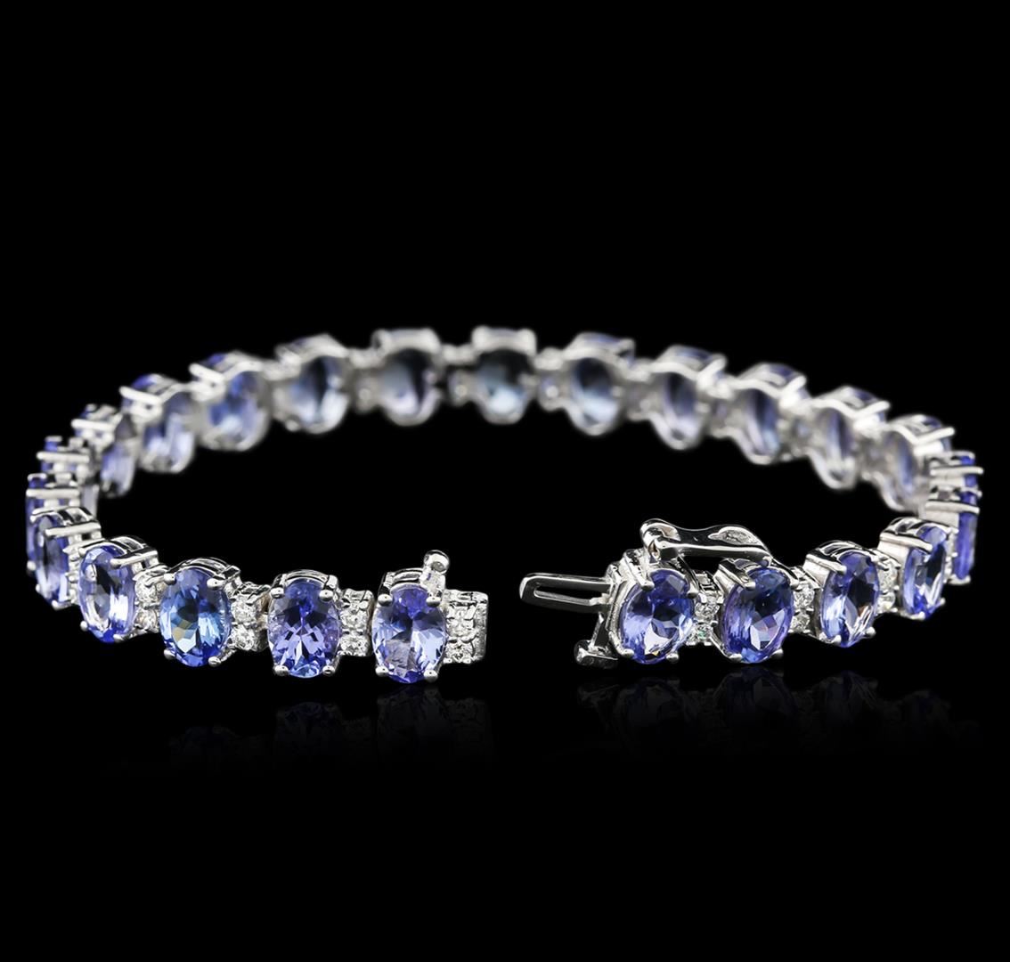 One electronically tested 14KT white gold ladies cast tanzanite and diamond bracelet with a hidden box clasp with safety closer with a bright polish finish. Measurements: 6.75" in length Identified with markings of "14K". Condition is new. Containing: Twenty-two prong set oval modified brilliant cut natural tanzanites, measuring 7.00 x 5.20 x 3.38mm, approximate total weight of 17.24ct., clarity is eye clean, type I, medium light, slightly grayish, violet color, (GIA V 4/2), cut is good. Forty-Eight prong set round brilliant cut diamonds, measuring 1.50 - 1.50 x 0.90mm (depth est.) approximate total weight of 48 Stones = 1.22ct. Clarity: SI-1 to I-1. Color: H - I, Cut is Good. All diamonds and colored gemstones are graded in the mounting, unless otherwise stated. Colored gemstones are presumed to have been subjected to commonly used enhancement processes. Total Weight of Colored Stones 17.24ct. Total Weight of Diamonds 1.22ct. Total Weight of Bracelet 17.70 grams. GGL Appraised at $7,555.00.