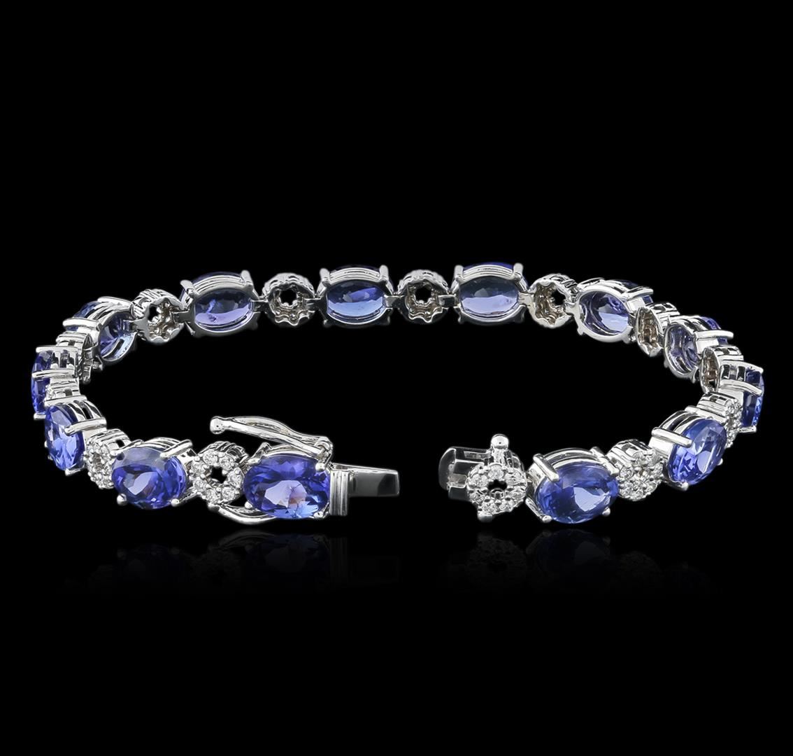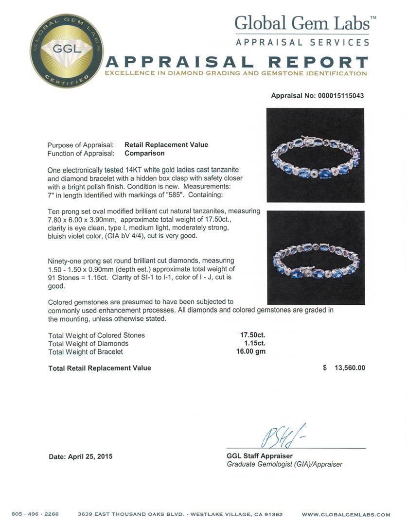 One electronically tested 14KT white gold ladies cast tanzanite and diamond bracelet with a hidden box clasp with safety closer with a bright polish finish. Measurements: 7" in length Identified with markings of "585". Condition is new. Containing: Ten prong set oval modified brilliant cut natural tanzanites, measuring 7.80 x 6.00 x 3.90mm, approximate total weight of 17.50ct., clarity is eye clean, type I, medium light, moderately strong, bluish violet color, (GIA bV 4/4), cut is very good. Ninety-One prong set round brilliant cut diamonds, measuring 1.50 - 1.50 x 0.90mm (depth est.) approximate total weight of 91 Stones = 1.15ct. Clarity: SI-1 to I-1. Color: I - J, Cut is Good. Colored gemstones are presumed to have been subjected to commonly used enhancement processes. All diamonds and colored gemstones are graded in the mounting, unless otherwise stated. Total Weight of Colored Stones 17.50ct. Total Weight of Diamonds 1.15ct. Total Weight of Bracelet 16.00 grams. GGL Appraised at $13,560.00.