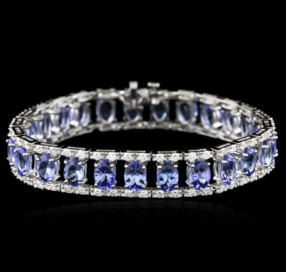 One electronically tested 14KT white gold ladies cast tanzanite and diamond bracelet with a hidden box clasp with safety closer with a bright polish finish. Measurements: 6.75" in length Identified with markings of "14K". Condition is new. Containing: Twenty-five prong set oval modified brilliant cut natural tanzanites, measuring 7.00 x 5.00 x 3.25mm, approximate total weight of 17.64ct., clarity is eye clean, type I, medium light, very slightly grayish, violet color, (GIA V 4/3), cut is good. One Hundred prong set round brilliant cut diamonds, measuring 2.00 - 2.00 x 1.20mm (depth est.) approximate total weight of 100 Stones = 3.25ct. Clarity: SI-1 to I-1. Color: H - I, Cut is Good. All diamonds and colored gemstones are graded in the mounting, unless otherwise stated. Colored gemstones are presumed to have been subjected to commonly used enhancement processes. Total Weight of Colored Stones 17.64ct. Total Weight of Diamonds 3.25ct. Total Weight of Bracelet 26.90 grams. GGL Appraised at $11,855.00.