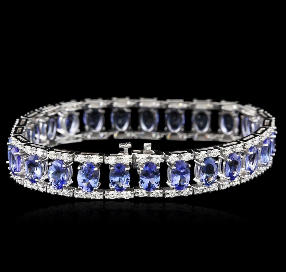 One electronically tested 14KT white gold ladies cast tanzanite and diamond bracelet with a hidden box clasp with safety closer with a bright polish finish. Measurements: 6.75" in length Identified with markings of "14K". Condition is new. Containing: Twenty-five prong set oval modified brilliant cut natural tanzanites, measuring 7.00 x 5.00 x 3.25mm, approximate total weight of 17.64ct., clarity is eye clean, type I, medium light, very slightly grayish, violet color, (GIA V 4/3), cut is good. One Hundred prong set round brilliant cut diamonds, measuring 2.00 - 2.00 x 1.20mm (depth est.) approximate total weight of 100 Stones = 3.25ct. Clarity: SI-1 to I-1. Color: H - I, Cut is Good. All diamonds and colored gemstones are graded in the mounting, unless otherwise stated. Colored gemstones are presumed to have been subjected to commonly used enhancement processes. Total Weight of Colored Stones 17.64ct. Total Weight of Diamonds 3.25ct. Total Weight of Bracelet 26.90 grams. GGL Appraised at $11,855.00.