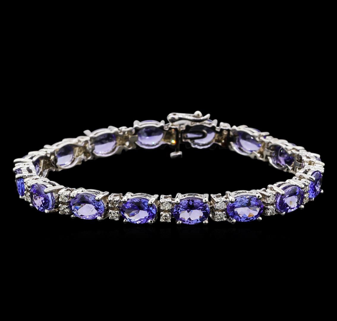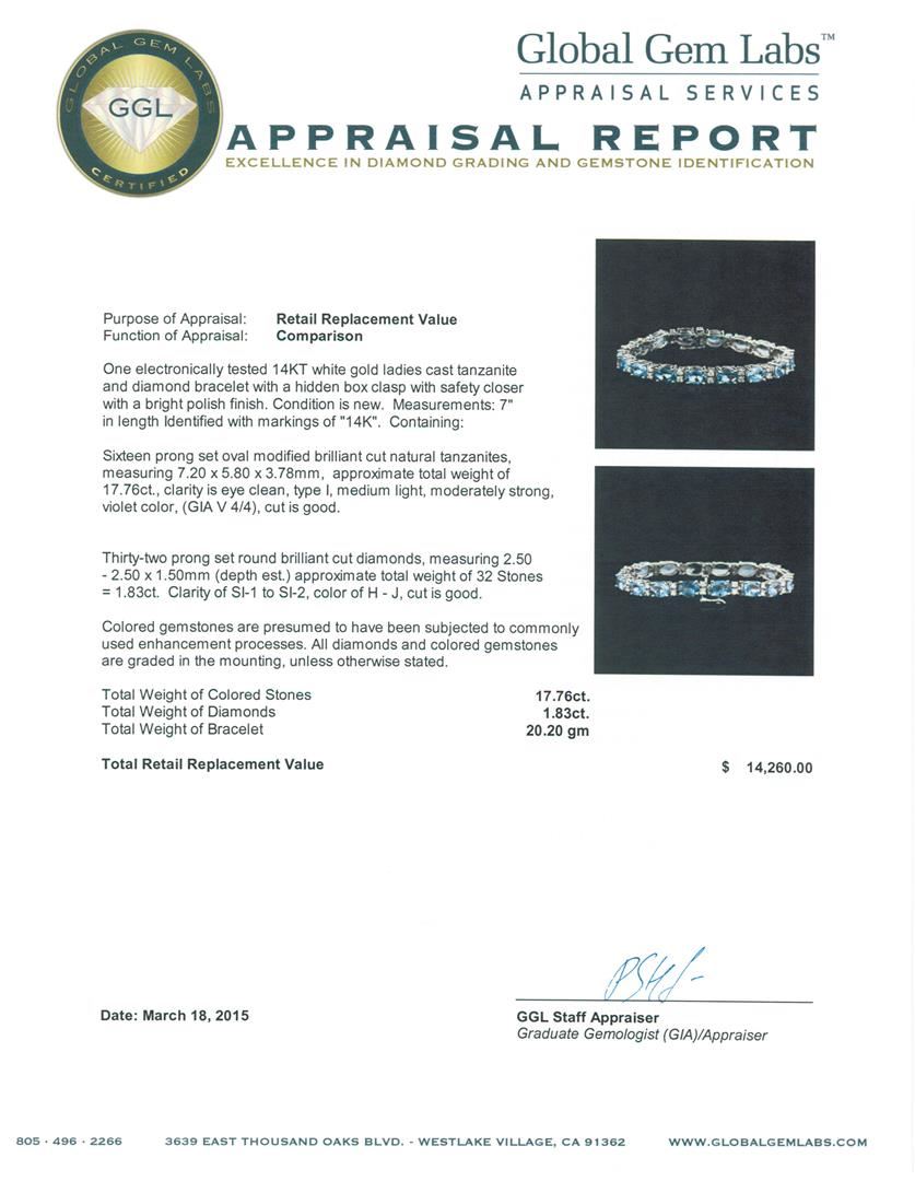 One electronically tested 14KT white gold ladies cast tanzanite and diamond bracelet with a hidden box clasp with safety closer with a bright polish finish. Measurements: 7" in length Identified with markings of "14K". Condition is new. Containing: Sixteen prong set oval modified brilliant cut natural tanzanites, measuring 7.20 x 5.80 x 3.78mm, approximate total weight of 17.76ct., clarity is eye clean, type I, medium light, moderately strong, violet color, (GIA V 4/4), cut is good. Thirty-Two prong set round brilliant cut diamonds, measuring 2.50 - 2.50 x 1.50mm (depth est.) approximate total weight of 32 Stones = 1.83ct. Clarity of SI-1 to SI-2, Color of H - J, Cut is Good. Colored gemstones are presumed to have been subjected to commonly used enhancement processes. All diamonds and colored gemstones are graded in the mounting, unless otherwise stated. Total Weight of Colored Stones 17.76ct. Total Weight of Diamonds 1.83ct. Total Weight of Bracelet 20.20 grams. GGL Appraised at $14,260.00.