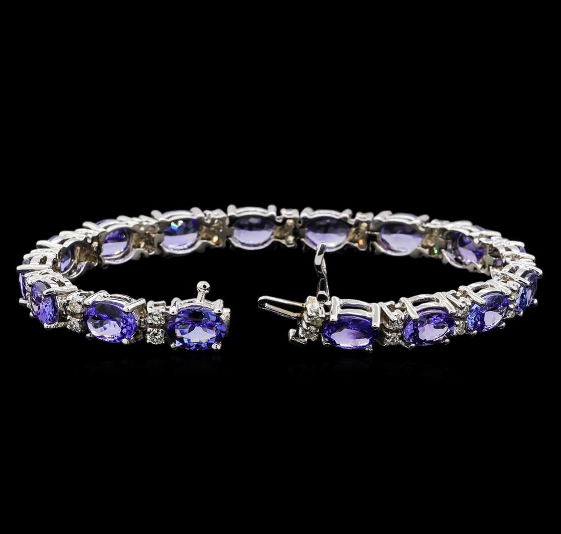 One electronically tested 14KT white gold ladies cast tanzanite and diamond bracelet with a hidden box clasp with safety closer with a bright polish finish. Measurements: 7" in length Identified with markings of "14K". Condition is new. Containing: Sixteen prong set oval modified brilliant cut natural tanzanites, measuring 7.20 x 5.80 x 3.78mm, approximate total weight of 17.76ct., clarity is eye clean, type I, medium light, moderately strong, violet color, (GIA V 4/4), cut is good. Thirty-Two prong set round brilliant cut diamonds, measuring 2.50 - 2.50 x 1.50mm (depth est.) approximate total weight of 32 Stones = 1.83ct. Clarity of SI-1 to SI-2, Color of H - J, Cut is Good. Colored gemstones are presumed to have been subjected to commonly used enhancement processes. All diamonds and colored gemstones are graded in the mounting, unless otherwise stated. Total Weight of Colored Stones 17.76ct. Total Weight of Diamonds 1.83ct. Total Weight of Bracelet 20.20 grams. GGL Appraised at $14,260.00.