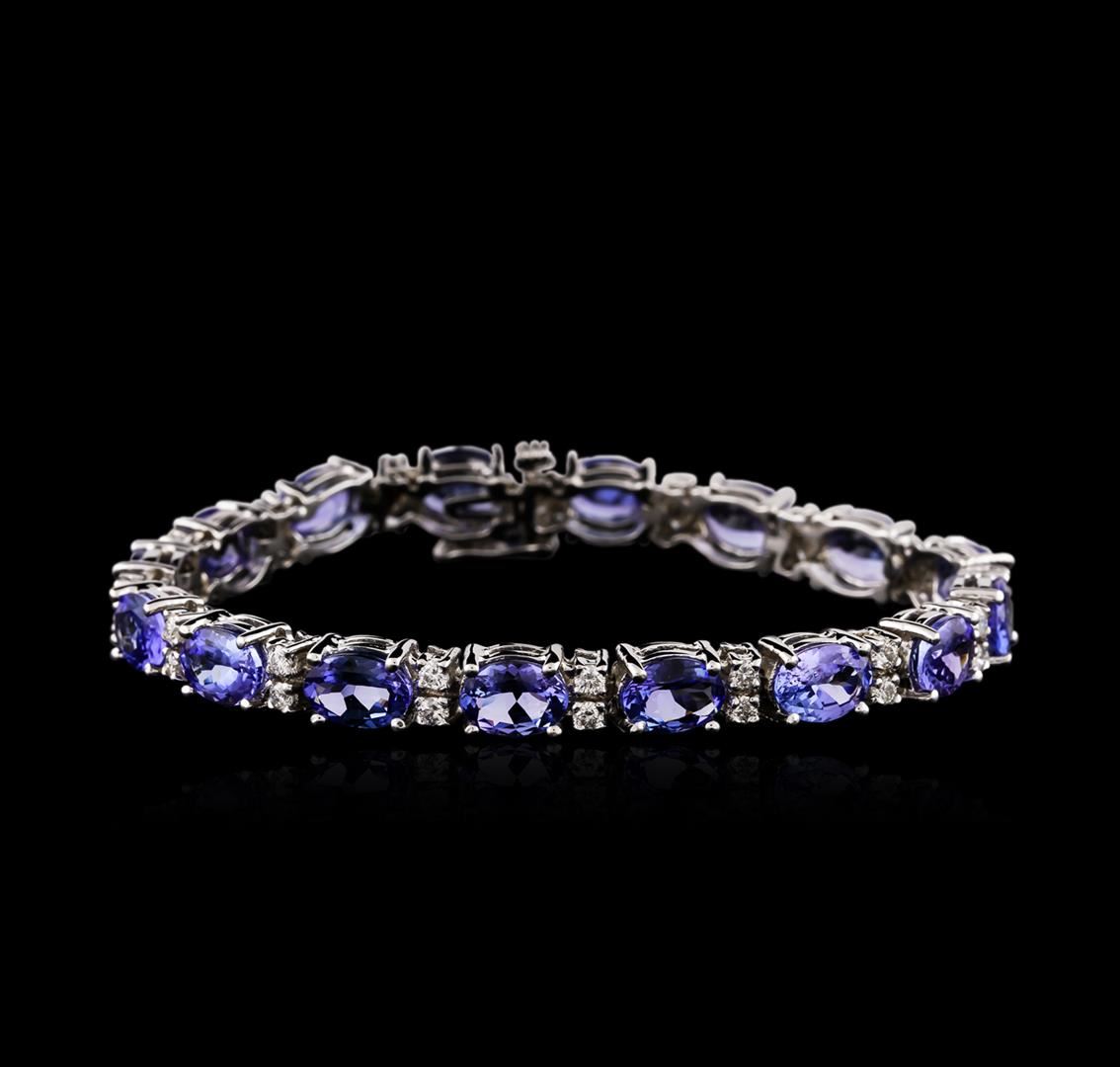 One electronically tested 14KT white gold ladies cast tanzanite and diamond bracelet with a hidden box clasp with safety closer with a bright polish finish. Measurements: 7" in length Identified with markings of "14K". Condition is new. Containing: Sixteen prong set oval modified brilliant cut natural tanzanites, measuring 7.20 x 5.80 x 3.78mm, approximate total weight of 17.76ct., clarity is eye clean, type I, medium light, moderately strong, violet color, (GIA V 4/4), cut is good. Thirty-Two prong set round brilliant cut diamonds, measuring 2.50 - 2.50 x 1.50mm (depth est.) approximate total weight of 32 Stones = 1.83ct. Clarity of SI-1 to SI-2, Color of H - J, Cut is Good. Colored gemstones are presumed to have been subjected to commonly used enhancement processes. All diamonds and colored gemstones are graded in the mounting, unless otherwise stated. Total Weight of Colored Stones 17.76ct. Total Weight of Diamonds 1.83ct. Total Weight of Bracelet 20.20 grams. GGL Appraised at $14,260.00.