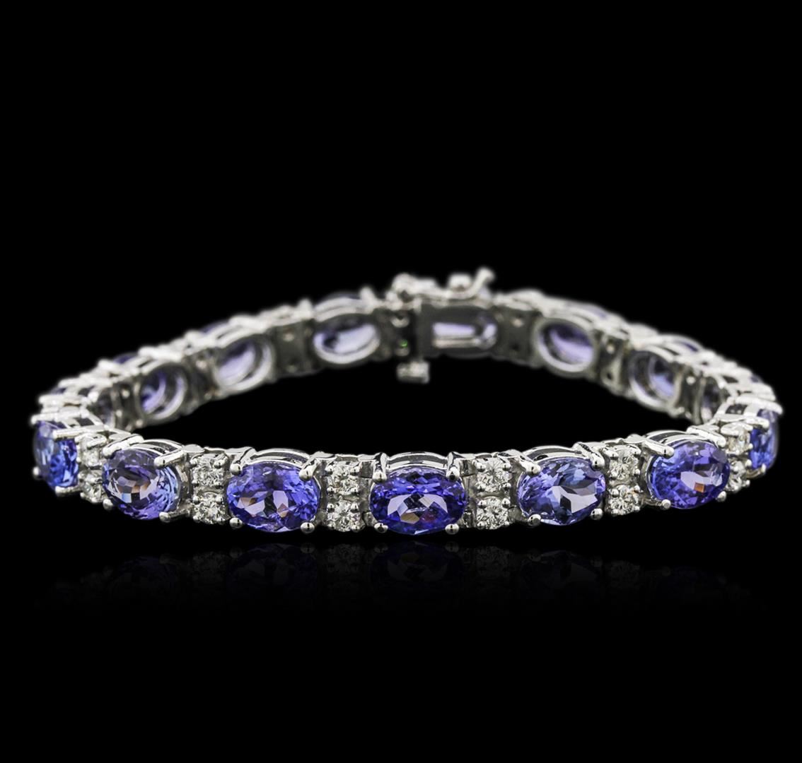 One electronically tested 14KT white gold ladies cast tanzanite and diamond bracelet with a hidden box clasp with safety closer with a bright polish finish. Measurements: 7 " in length Identified with markings of "14K". Condition is new. Containing: Fifteen prong set oval modified brilliant cut natural tanzanites, measuring 8.00 x 5.70 x 3.71mm, approximate total weight of 17.85ct., clarity is eye clean, type I, medium light, very slightly grayish, violet color, (GIA V 4/3), cut is good. Thirty prong set round brilliant cut diamonds, measuring 2.50 - 2.50 x 1.50mm (depth est.) approximate total weight of 30 Stones = 1.71ct. Clarity: SI-1 to SI-2. Color: H - I, Cut is Good. Colored gemstones are presumed to have been subjected to commonly used enhancement processes. All diamonds and colored gemstones are graded in the mounting, unless otherwise stated. Total Weight of Colored Stones 17.85ct. Total Weight of Diamonds 1.71ct. Total Weight of Bracelet 23.60 grams. GGL Appraised at $13,350.00.