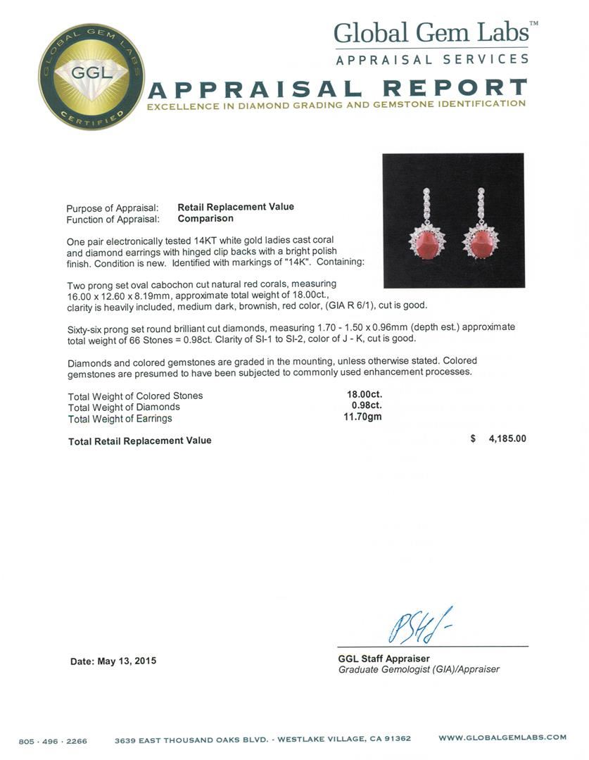 One pair electronically tested 14KT white gold ladies cast coral and diamond earrings with hinged clip backs with a bright polish finish. Identified with markings of "14K". Condition is new. Containing: Two prong set oval cabochon cut natural red corals, measuring 16.00 x 12.60 x 8.19mm, approximate total weight of 18.00ct., clarity is heavily included, medium dark, brownish, red color, (GIA R 6/1), cut is good. Sixty-Six prong set round brilliant cut diamonds, measuring 1.70 - 1.50 x 0.96mm (depth est.) approximate total weight of 66 Stones = 0.98ct. Clarity: SI-1 to SI-2. Color: J - K, Cut is Good. Diamonds and colored gemstones are graded in the mounting, unless otherwise stated. Colored gemstones are presumed to have been subjected to commonly used enhancement processes. Total Weight of Colored Stones 18.00ct. Total Weight of Diamonds 0.98ct. Total Weight of Earrings 11.70 grams. GGL Appraised at $4,185.00.
