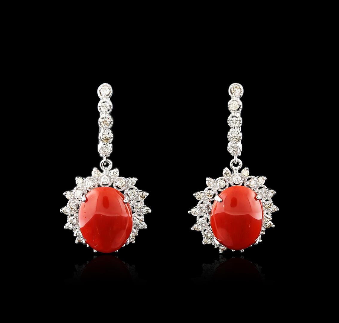 One pair electronically tested 14KT white gold ladies cast coral and diamond earrings with hinged clip backs with a bright polish finish. Identified with markings of "14K". Condition is new. Containing: Two prong set oval cabochon cut natural red corals, measuring 16.00 x 12.60 x 8.19mm, approximate total weight of 18.00ct., clarity is heavily included, medium dark, brownish, red color, (GIA R 6/1), cut is good. Sixty-Six prong set round brilliant cut diamonds, measuring 1.70 - 1.50 x 0.96mm (depth est.) approximate total weight of 66 Stones = 0.98ct. Clarity: SI-1 to SI-2. Color: J - K, Cut is Good. Diamonds and colored gemstones are graded in the mounting, unless otherwise stated. Colored gemstones are presumed to have been subjected to commonly used enhancement processes. Total Weight of Colored Stones 18.00ct. Total Weight of Diamonds 0.98ct. Total Weight of Earrings 11.70 grams. GGL Appraised at $4,185.00.