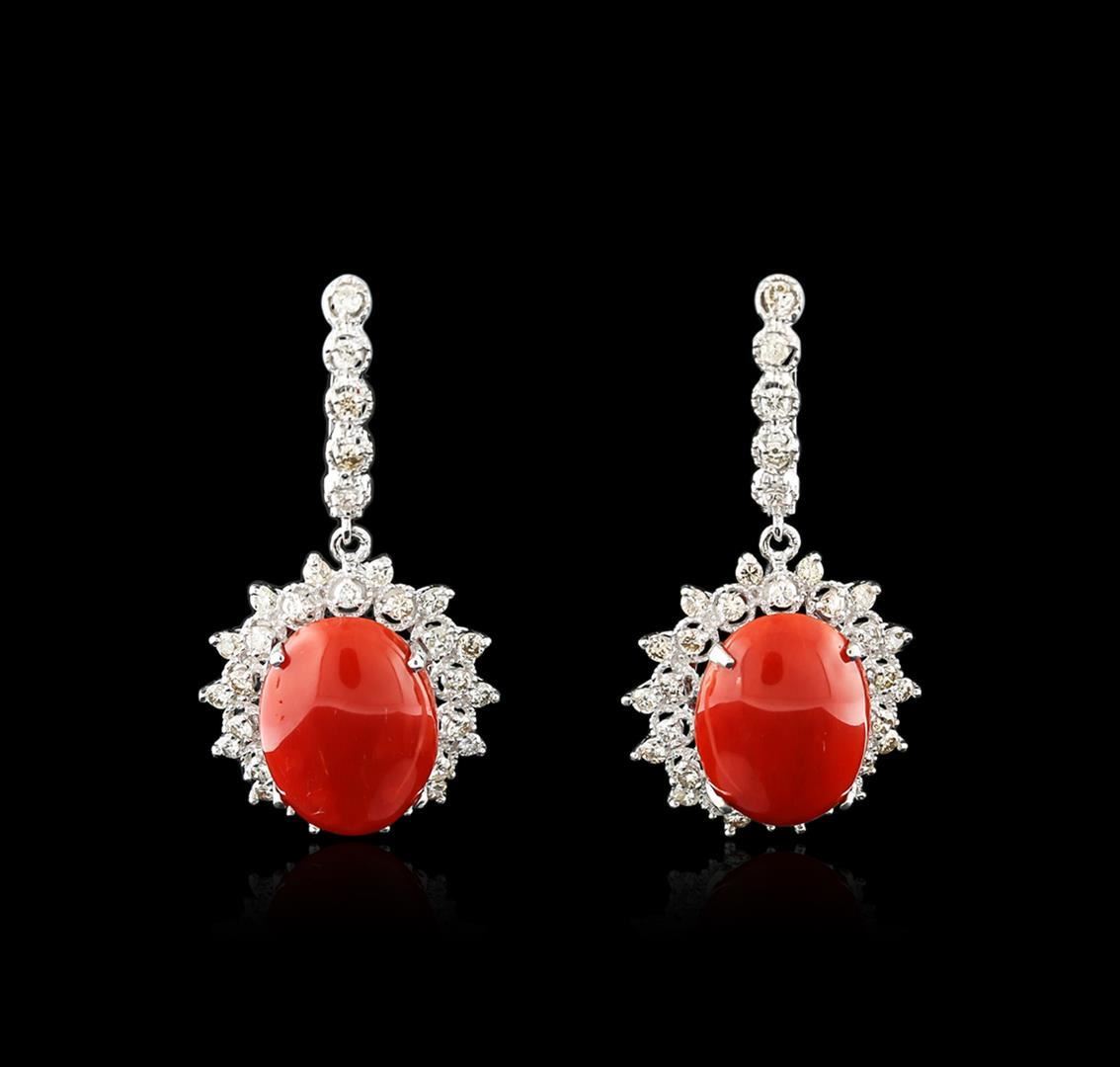 One pair electronically tested 14KT white gold ladies cast coral and diamond earrings with hinged clip backs with a bright polish finish. Identified with markings of "14K". Condition is new. Containing: Two prong set oval cabochon cut natural red corals, measuring 16.00 x 12.60 x 8.19mm, approximate total weight of 18.00 ct., clarity is heavily included, medium dark, brownish, red color, (GIA R 6/1), cut is good. Sixty-Six prong set round brilliant cut diamonds, measuring 1.70 - 1.50 x 0.96mm (depth est.) approximate total weight of 66 Stones = 0.98ct. Clarity: SI-1 to SI-2. Color: J - K, Cut is Good. Diamonds and colored gemstones are graded in the mounting, unless otherwise stated. Colored gemstones are presumed to have been subjected to commonly used enhancement processes. Total Weight of Colored Stones 18.00 ct. Total Weight of Diamonds 0.98ct. Total Weight of Earrings 11.70 grams. GGL Appraised.