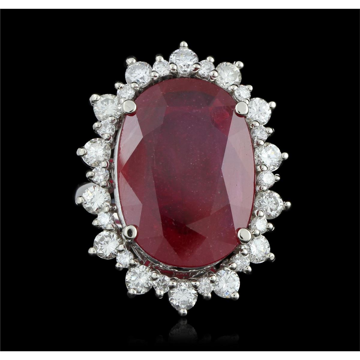 One electronically tested 14KT white gold ladies cast ruby and diamond ring with a bright polish finish. Condition is new, good workmanship. The featured ruby is set within a diamond bezel, completed by a three and one-half millimeter wide band. Identified with markings of "14K". Containing: One prong set oval mixed cut natural ruby, measuring 20.50 x 14.70 x 5.40mm, 10% bulge factor, approximate weight of 18.04ct., clarity is heavily included, type II, medium dark, moderately strong, slightly purplish red color, (GIA slpR 6/4), cut is good. Transmitting light somewhat diffusely, transparent to translucent. Naturally occurring internal & external characteristics are present. Indications of laboratory high temperature heat treatment, with glass & flux additives. Colored Stone Grading Report attached. Graded in the setting. Ruby has a low tolerance to rhodium plating, repolishing the surface, & ultrasonic cleaning. Twenty-eight prong set round brilliant cut diamonds, measuring 3.20 - 1.90 x 1.53mm (depth est.) approximate total weight of 28 Stones = 2.05ct. Graded in the setting. Clarity SI-1 to 1-2. Color G - I. Total Weight of Colored Stones 18.04ct. Total Weight of Diamonds 2.05ct. Total Weight of Ring 12.40gm. AIG Appraised at $11,355.00.