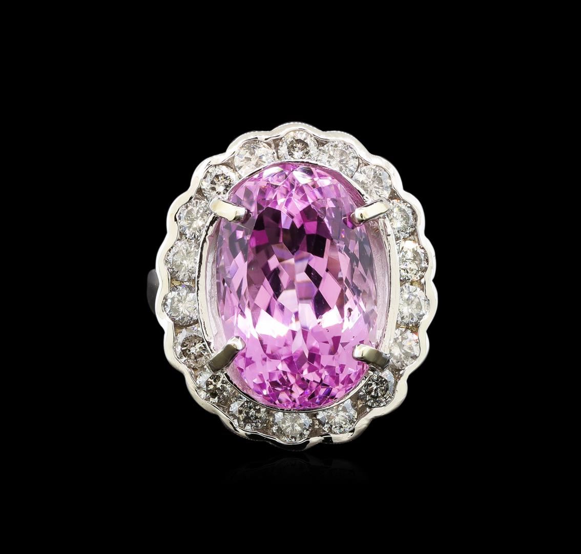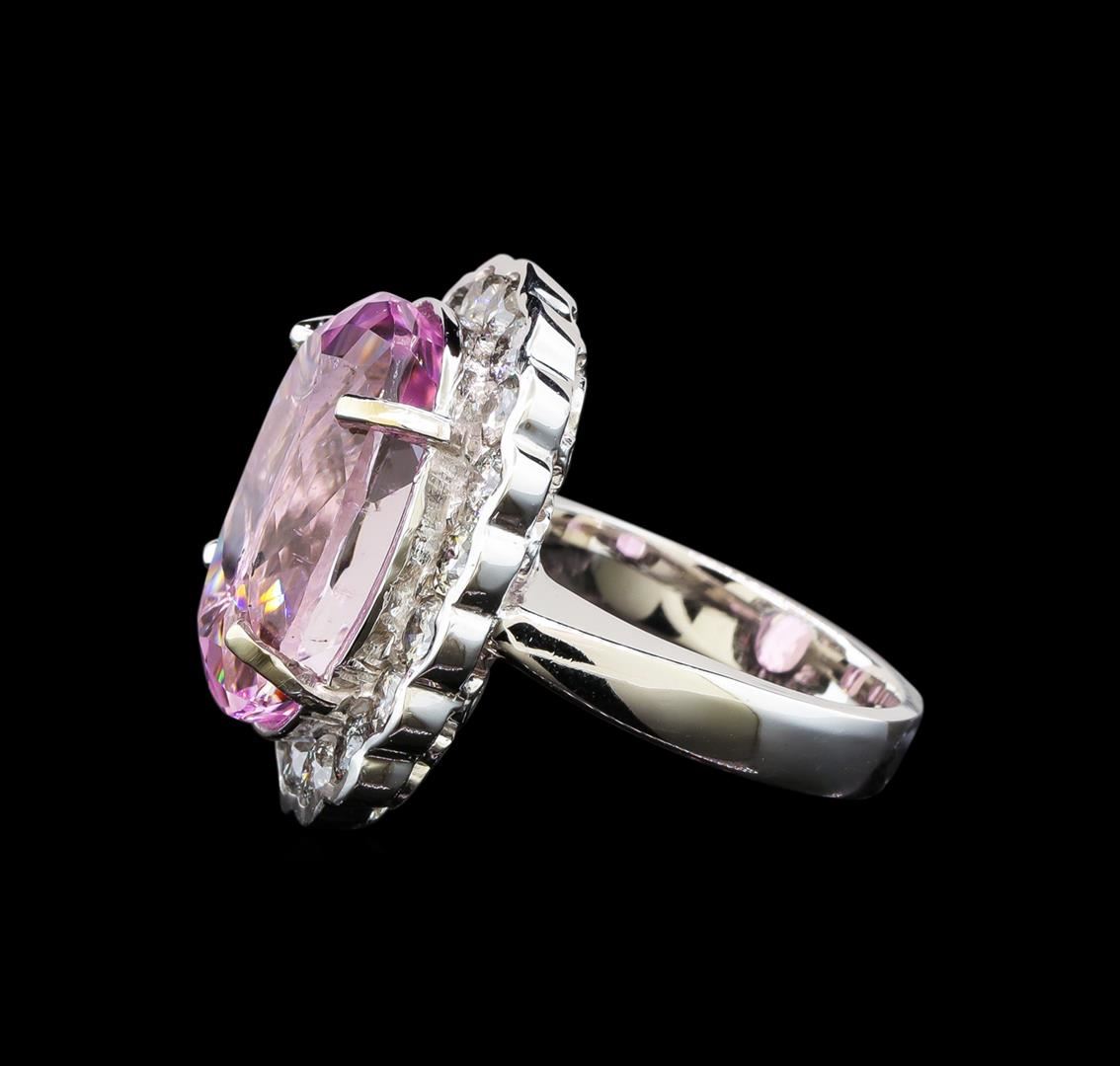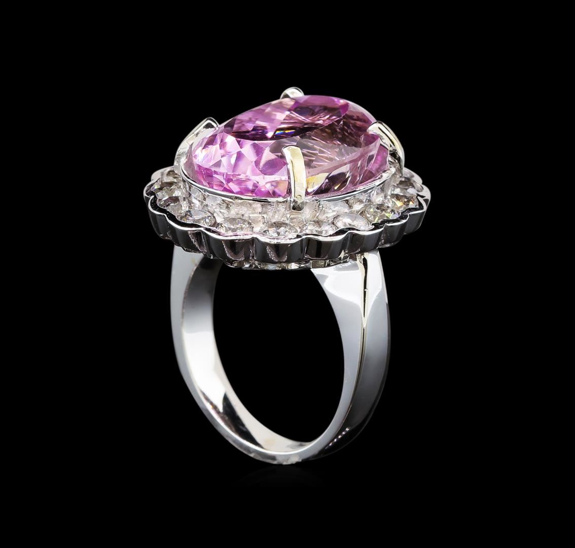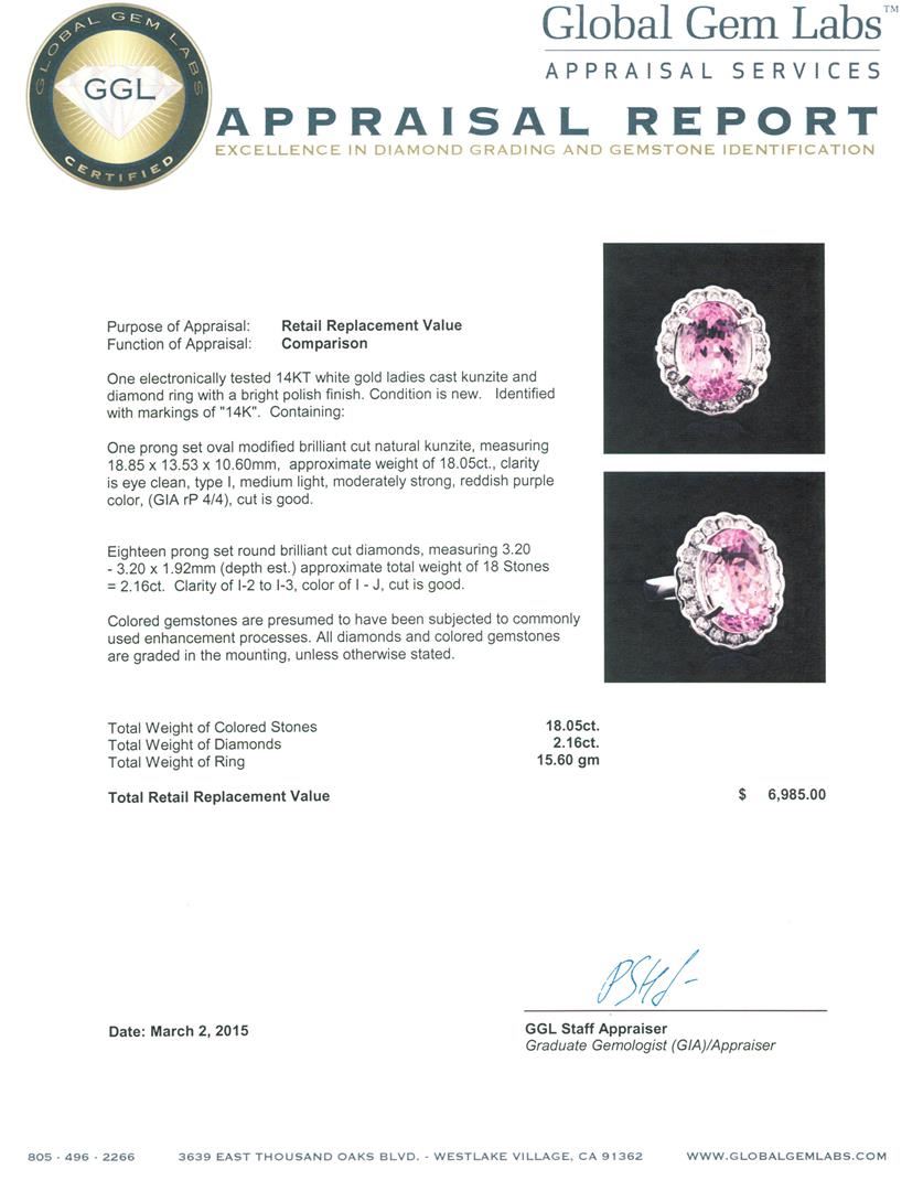 One electronically tested 14KT white gold ladies cast kunzite and diamond ring with a bright polish finish. Identified with markings of "14K". Condition is new. Containing: One prong set oval modified brilliant cut natural kunzite, measuring 18.85 x 13.53 x 10.60mm, approximate weight of 18.05ct., clarity is eye clean, type I, medium light, moderately strong, reddish purple color, (GIA rP 4/4), cut is good. Eighteen prong set round brilliant cut diamonds, measuring 3.20 - 3.20 x 1.92mm (depth est.) approximate total weight of 18 Stones = 2.16ct. Clarity: I-2 to I-3. Color: I - J, Cut is Good. Colored gemstones are presumed to have been subjected to commonly used enhancement processes. All diamonds and colored gemstones are graded in the mounting, unless otherwise stated. Total Weight of Colored Stones 18.05ct. Total Weight of Diamonds 2.16ct. Total Weight of Ring 15.60 grams. GGL Appraised at $6,985.00.