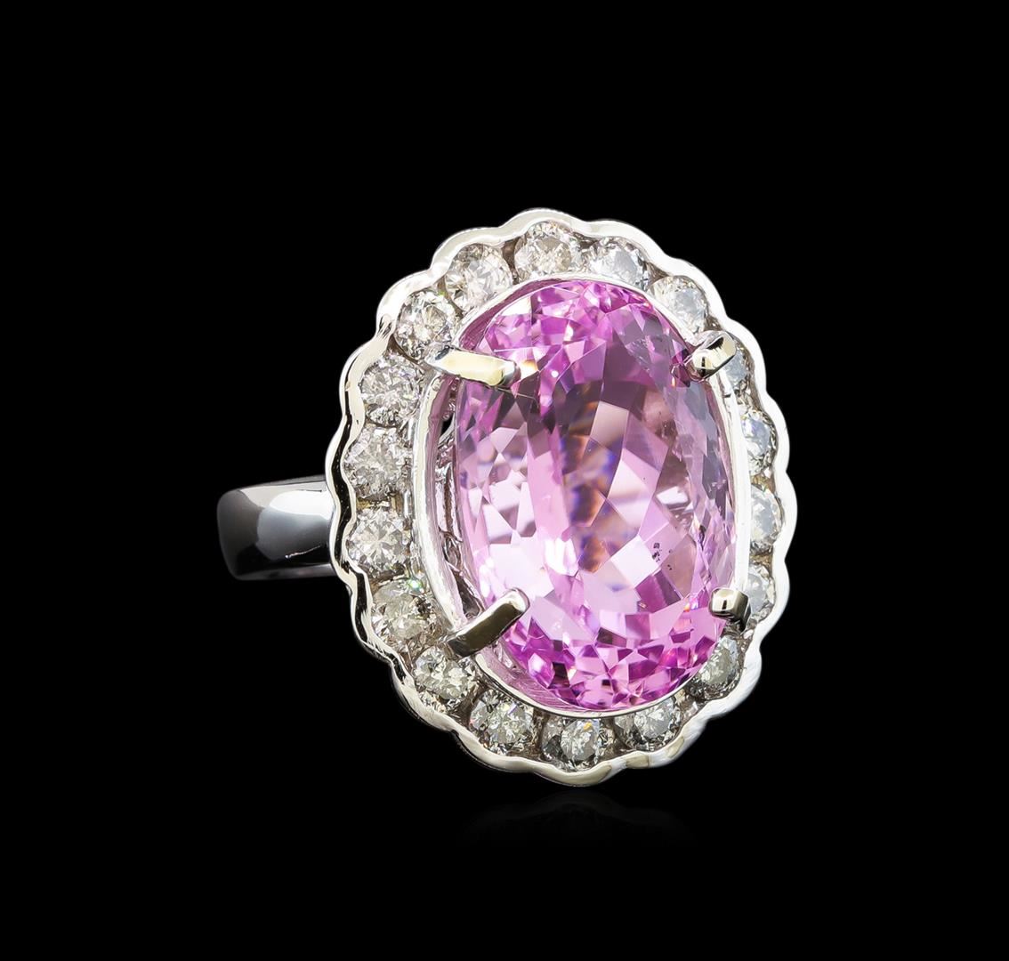 One electronically tested 14KT white gold ladies cast kunzite and diamond ring with a bright polish finish. Identified with markings of "14K". Condition is new. Containing: One prong set oval modified brilliant cut natural kunzite, measuring 18.85 x 13.53 x 10.60mm, approximate weight of 18.05ct., clarity is eye clean, type I, medium light, moderately strong, reddish purple color, (GIA rP 4/4), cut is good. Eighteen prong set round brilliant cut diamonds, measuring 3.20 - 3.20 x 1.92mm (depth est.) approximate total weight of 18 Stones = 2.16ct. Clarity: I-2 to I-3. Color: I - J, Cut is Good. Colored gemstones are presumed to have been subjected to commonly used enhancement processes. All diamonds and colored gemstones are graded in the mounting, unless otherwise stated. Total Weight of Colored Stones 18.05ct. Total Weight of Diamonds 2.16ct. Total Weight of Ring 15.60 grams. GGL Appraised at $6,985.00.