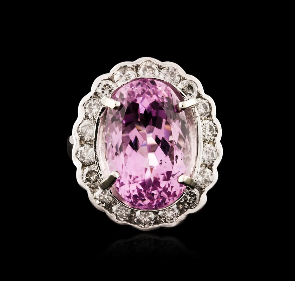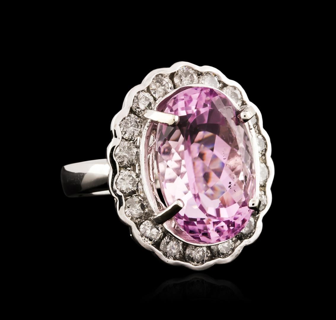 One electronically tested 14KT white gold ladies cast kunzite and diamond ring with a bright polish finish. Identified with markings of "14K". Condition is new. Containing: One prong set oval modified brilliant cut natural kunzite, measuring 18.85 x 13.53 x 10.60mm, approximate weight of 18.05ct., clarity is eye clean, type I, medium light, moderately strong, reddish purple color, (GIA rP 4/4), cut is good. Eighteen prong set round brilliant cut diamonds, measuring 3.20 - 3.20 x 1.92mm (depth est.) approximate total weight of 18 Stones = 2.16ct. Clarity: I-2 to I-3. Color: I - J, Cut is Good. Colored gemstones are presumed to have been subjected to commonly used enhancement processes. All diamonds and colored gemstones are graded in the mounting, unless otherwise stated. Total Weight of Colored Stones 18.05ct. Total Weight of Diamonds 2.16ct. Total Weight of Ring 15.60 grams. GGL Appraised at $6,985.00.