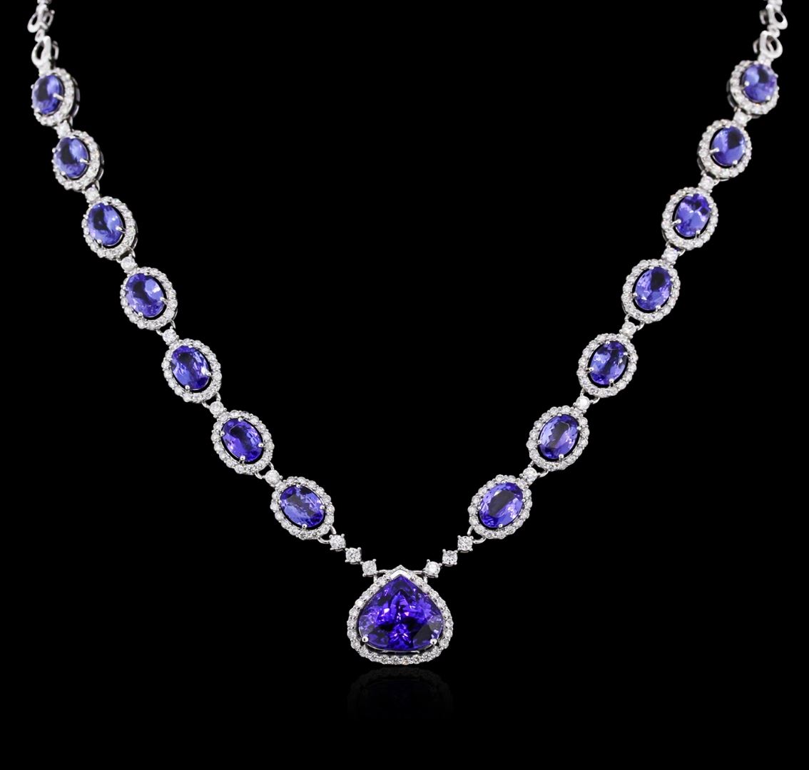 One necklace featuring: 14KT white gold weighing 22.25 grams containing 15 tanzanites with a total weight of 18.07ct and round diamonds with a total weight of 3.70ct.